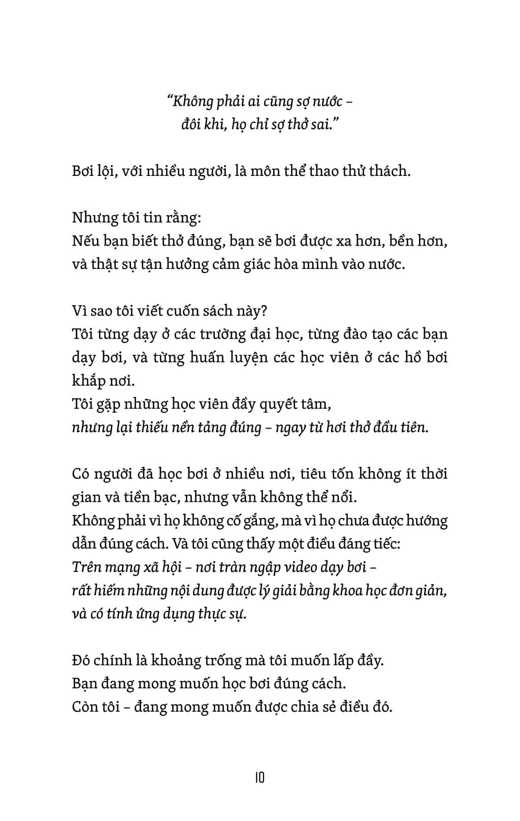 Cuốn sách này ra đời để giải quyết khoảng trống đó. Không chỉ cho người học bơi, mà cho bất kỳ ai đang thở – đặc biệt là những người cần hồi phục sức khỏe hô hấp, tâm lý, hoặc muốn tăng cường thể lực an toàn, khoa học.