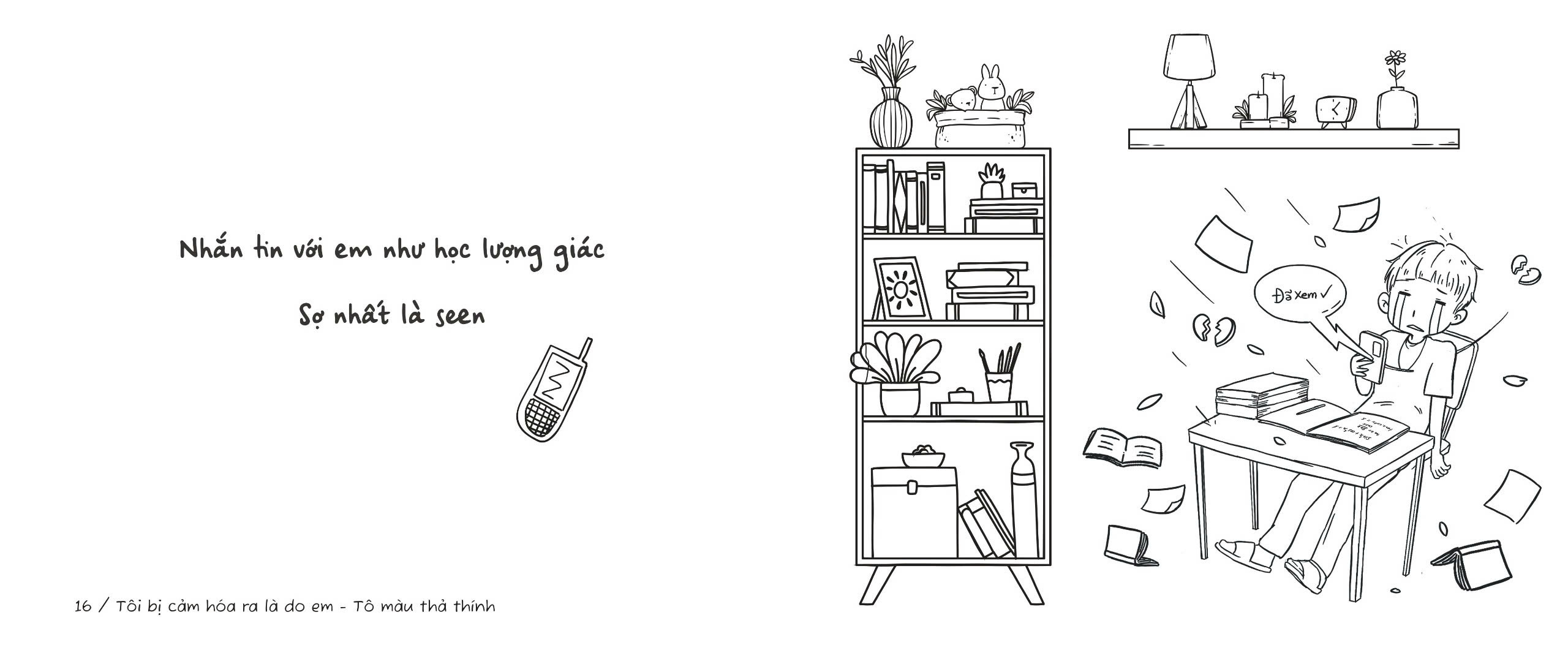 Phiên bản tô màu: “Tôi bị cảm hóa ra là do em - Tô màu thả thính” là sự kết hợp giữa những câu chơi chữ lém lỉnh của Phạm Duy Phúc và những bức tranh tinh nghịch của họa sĩ Thành Hà, họa sĩ trẻ gây ấn tượng với nét vẽ tinh nghịch, hài hước trong cộng đồng các bạn yêu vẽ minh họa.