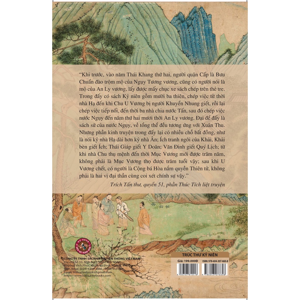 Mua tại Tiktok- Giới thiệu cuốn sách Căn cứ vào lời giới thiệu của tác giả ở đầu cuốn sách, có thể xác định Trúc thư kỷ niên là một bộ sử của nước Ngụy thời Chiến Quốc, được dùng làm đồ tùy táng chôn theo trong mộ của Ngụy Tương vương (hoặc Ngụy An Ly vương). Sau này, đến thời nhà Tấn có một tên trộm mộ tên là Bưu Chuẩn tình cờ đào trộm đúng vào mộ của Ngụy Tương Vương, phát hiện nên bộ sách và nhiều sách khác. Trúc thư kỷ niên là tên do người sau đặt, gọi “trúc thư” do là sách thẻ tre, các sự kiện được chép theo năm nên gọi là “kỷ niên”. Trúc thư kỷ niên nguyên bản được viết bằng chữ khoa đẩu, sau này được chỉnh lý, sắp xếp và viết lại bằng văn tự đương thời. Cuốn sách là bản dịch toàn văn Kim bản Trúc thư kỷ niên dựa trên bản in nằm trong bộ Hội khắc tam đại di thư, được in vào năm Vạn Lịch thứ hai mươi hai đời nhà Minh, tương ứng với năm 1594 theo Tây lịch, do Triệu Tiêu biên soạn. Bố cục cuốn sách gồm hai quyển, được chép theo thể biên niên. Quyển thượng chép các sự kiện từ thời Hoàng Đế Hiên Viên thị đến hết thời nhà Ân; quyển hạ chép việc trong thời nhà Chu, từ Chu Vũ Vương tới năm thứ mười sáu đời Chu Noản Vương. Nội dung trong sách bao gồm: phần chính văn chép việc theo năm; phần phụ văn chép việc xuyên suốt theo sự kiện, nội dung chủ yếu là bổ sung cho chính văn; phần nguyên chú là phần chú thích gốc trong văn bản, chủ yếu chú thích cho các câu từ có nghi vấn hoặc cung cấp thêm một số thông tin; và phần chú thích của người dịch, ngoài việc giải thích một số từ hay câu mà lời dịch chưa thật sự rõ ý, còn có thêm các ghi chép về cùng sử kiện trong các tài liệu khác.