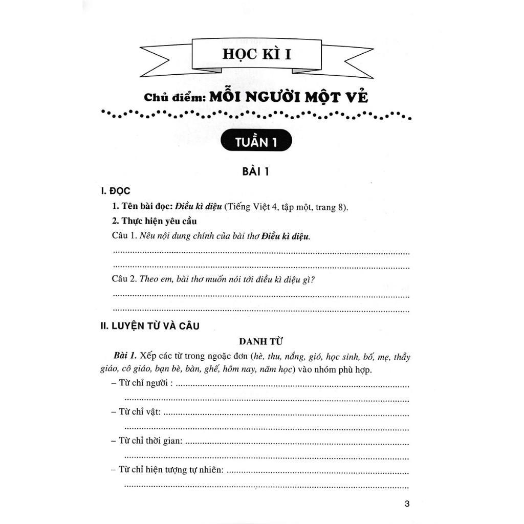 Quyển sách được biên soạn theo đúng chuẩn của Bộ giáo dục và đào tạo, với các bài tập "Tập đọc, luyện từ và câu, viết" sẽ mang đến cho các em nhiều dạng bài để ôn tập và phát triển kĩ năng tư duy khi học bộ môn này.