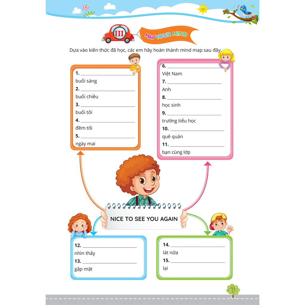 - Map your mind – Tự hoàn thành sơ đồ tư duy về từ vựng Sau mỗi Unit, các em sẽ điền từ vừa được học để hoàn thành sơ đồ tư duy, hoạt động này giúp các con tự kiểm tra kiến thức và ghi nhớ từ vựng theo logic.