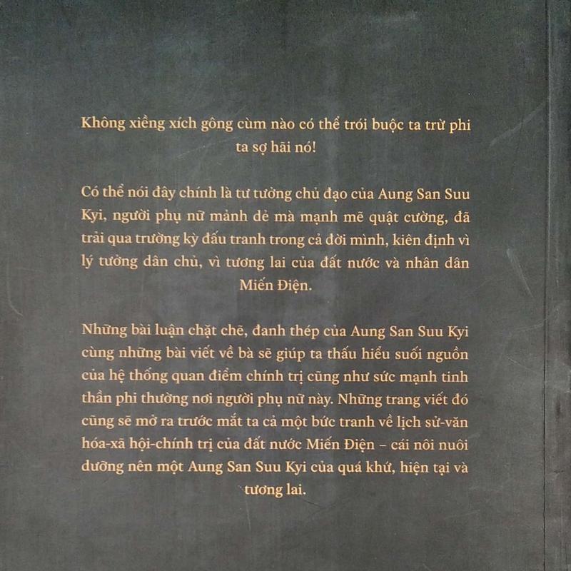 Những bài luận chặt chẽ, đanh thép của Aung San Suu Kyi cùng những bài viết về bà sẽ giúp ta thấu hiểu suối nguồn của hệ thống qian điểm chính trị cũng như sức mạnh tinh thần phi thường nơi người phụ nữ này. Những trang viết đó cũng sẽ mở ra trước mắt ta cả một bức tranh về lịch sử - văn hóa - xã hội - chính trị của đất nước Miến Điện - cái nôi nuôi dưỡng nên một Aung San Suu Kyi của quá khứ, hiện tại và tương lai.