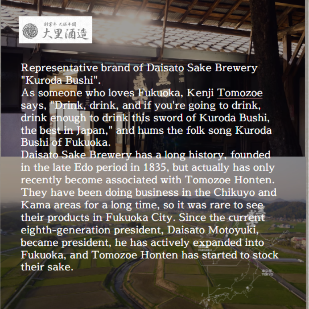 Đã 30 năm kể từ khi nó được phát hành lần đầu tiên. Loại rượu sake ngọt ngào không lọc này là loại phổ biến nhất. Hương vị đậm đà nhưng vẫn giữ được độ thơm ngon, ngọt dịu của gạo tạo nên sự cân bằng hoàn hảo. Rượu sake không lọc, "Kuroda Bushi Nigorizake", được làm từ gạo thu hoạch vào đầu mùa thu đã hấp thụ những điều tốt lành của vùng đất ở làng Kama, khiến nó trở thành một loại "sake địa phương" thực sự. Loại rượu sake mới, thường được hoàn thành vào giữa tháng 11, có hơi sủi bọt nhẹ và hương vị đậm đà, có thể thưởng thức với dư vị sảng khoái. Thích hợp dùng lạnh với các món ăn đậm hương vị như thịt nướng hay ẩm thực Trung Hoa. Sake type: Nigorizake Đánh bóng gạo: 70% Cồn: 18% Độ axit: 1,1 SMV: -10 Thể tích thực: 720ml Lưu ý độ tuổi được phép sử dụng đồ uống có cồn theo quy định, phụ nữ có thai và cho con bú nên hạn chế hoặc không sử dụng. Nsx: : Oosato Shuzo Co., Ltd NK&PP: Công ty TNHH STARMARK VIETNAM  Xuất xứ: Nhật Bản