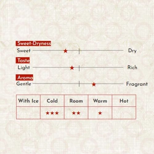 Xuất xứ: Nhật Bản Nồng độ cồn: 15% Thành phần: Lên men từ nước, gạo (nội địa Nhật), men gạo Koji (nội địa Nhật) Hướng dẫn sử dụng: Có thể uống tại nhiệt độ phòng 15 - 20 độ.