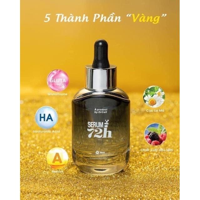 Serum 72h Dr Cell - Thành phần: Acid citric, Retinol, Glutathione. Avocado oil. Hyaluronic acid - HA. Dipotassium glycyrhizinate. Zemea Propanediol, Collagen từ thực vật. Mulberry root extract, Chamomill Recutita Flower Extract, Menthol.