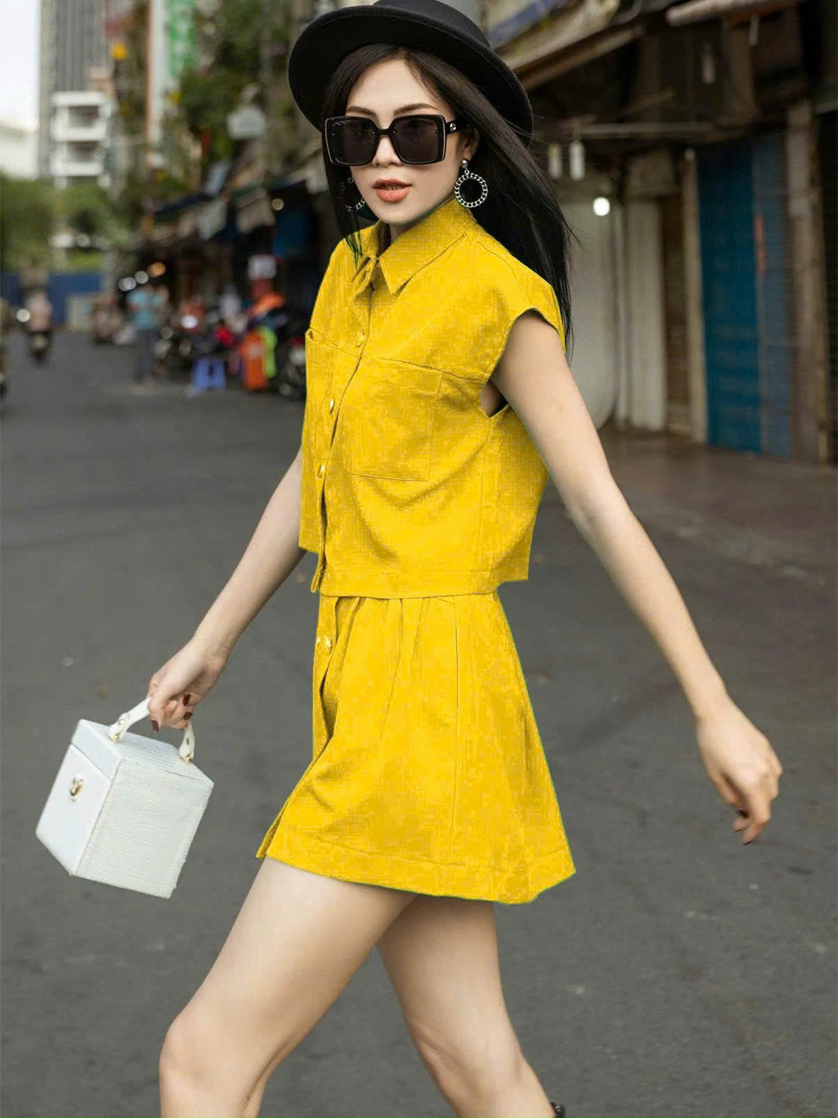 ღ THÔNG TIN SẢN PHẨM: Tên sản phẩm: Set áo quần vàng trễ vai Màu sắc: vàng Chất liệu: chéo dày Chi tiết sản phẩm: không lót, không túi. Thông