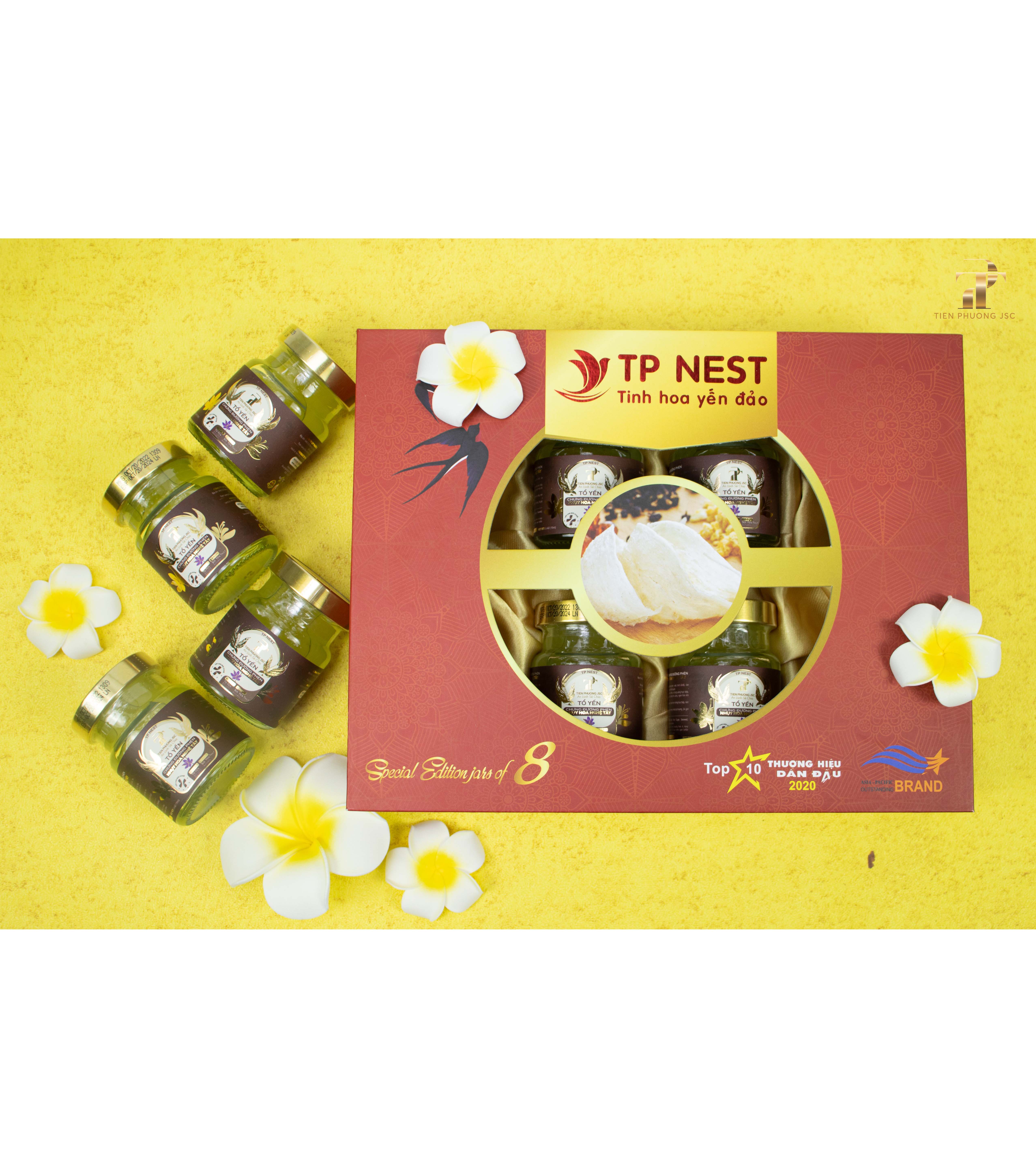 Set hộp quà yến cao cấp 03 - Tiến Phương JSC , bao gồm: - 8 hũ tổ yến chưng Nhụy hoa nghệ tây (70 ml/hũ) - Hộp quà - Túi đựng cao cấp