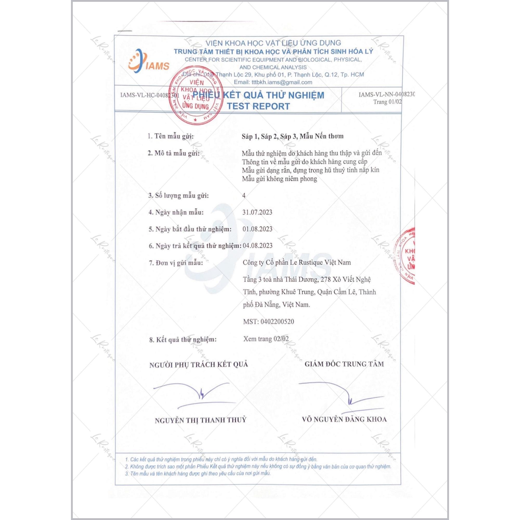 Mua tại Tiktok► Nến Thơm Trị Liệu Le Rustique là sản phẩm nến thơm có mùi hương nhẹ nhàng từ thiên nhiên, hũ đựng được làm từ vỏ Quế Trà My tự nhiên tái chế và thân thiện với môi trường. Nguyện liệu nến thơm được nhập trực tiếp chính hãng từ Mỹ và một số trang trại hữu cơ ở Việt Nam. ► Chúng tôi cam kết 100% các sản phẩm không chứa các chất độc hại thường có trong hương liệu như Diethylphtalat (DEP), Toluen, Arsen, Chì, Benzene và được kiểm nghiệm thành phần GC-MS bởi TRUNG TÂM THIẾT BỊ KHOA HỌC VÀ PHÂN TÍCH SINH HÓA LÝ thuộc VIỆN KHOA HỌC VÀ VẬT LIỆU ỨNG DỤNG (IAMS) và kiểm nghiệm nghiệm an toàn bởi TRUNG TÂM DỊCH VỤ PHÂN TÍCH THÍ NGHIỆM TP.HỒ CHÍ MINH (CASE). Hũ nến vỏ Quế độc đáo và hiệu quả thư giãn trị liệu từ tinh dầu thiên nhiên - Nến thơm thủ công Le Rustique sẽ đồng hành cùng bạn trên hành trình thư giãn, nâng cao sức khỏe tinh thần mỗi ngày. ► Chứng nhận chất lượng: USDA - ORGANIC, CASE, IAMS