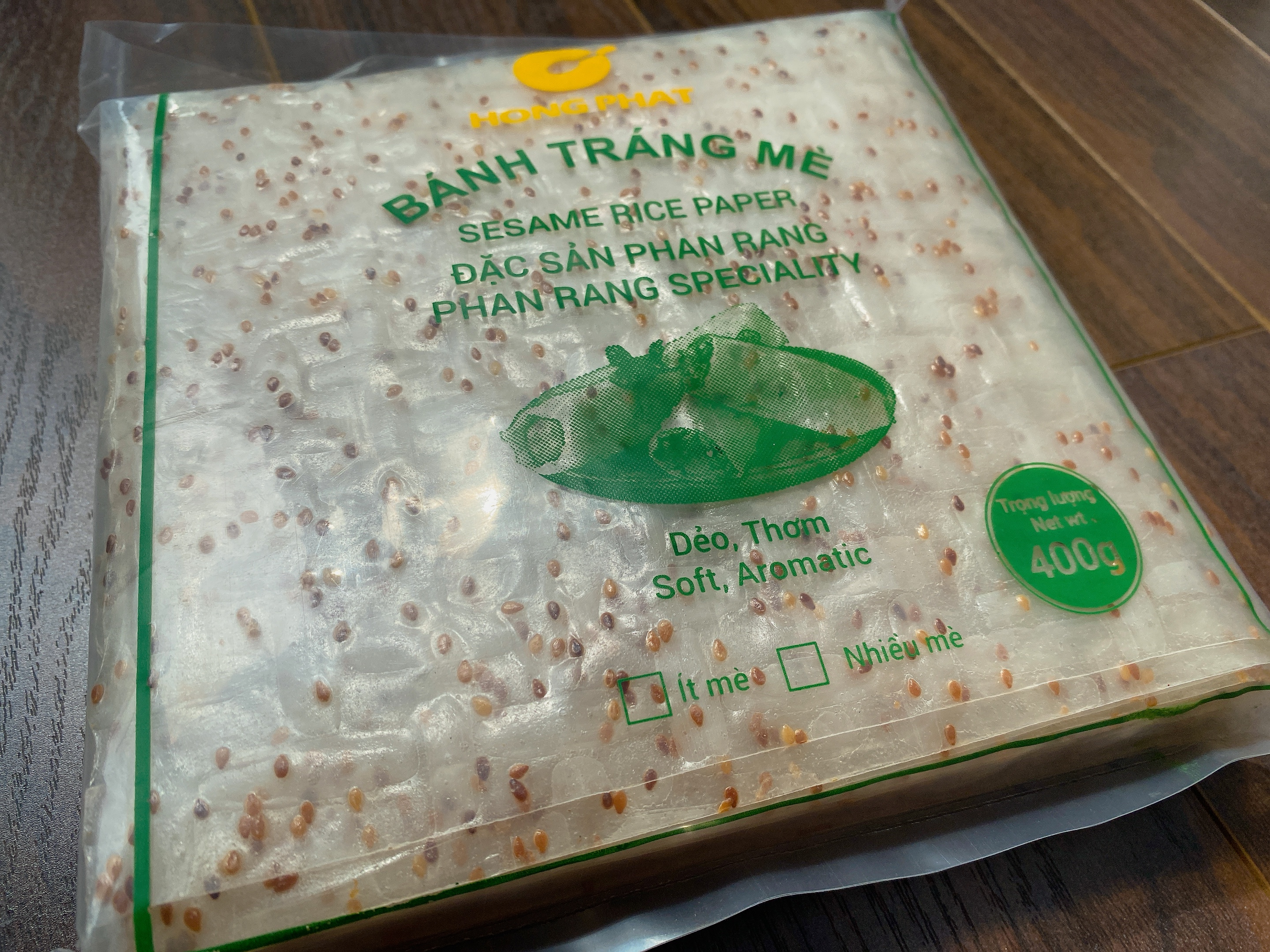 Bánh tráng mè, bánh tráng gỏi cuốn mè Hồng Phát đặc sản Phan Rang gói 400g Sản phẩm làm từ Gạo, bột khoai mì, muối và hạt mè. Nhúng nhẹ vào nước. Thích hợp cuốn