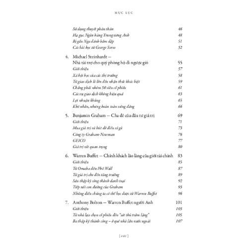 Sách thể hiện các hành động, tương tác của các nhà đầu tư với thị trường chứng khoán, trình bày phương pháp đầu tư của từng người, bao gồm những thương vụ đầu tư nổi bật, có điểm nhấn, những phi vụ nổi tiếng, từng gây chấn động thế giới. Ở cuối mỗi phần có phần tóm tắt các chiến lược súc tích, thuận lợi cho người đọc; có xếp hạng, chấm điểm nhà đầu tư ở cuối mỗi chương.