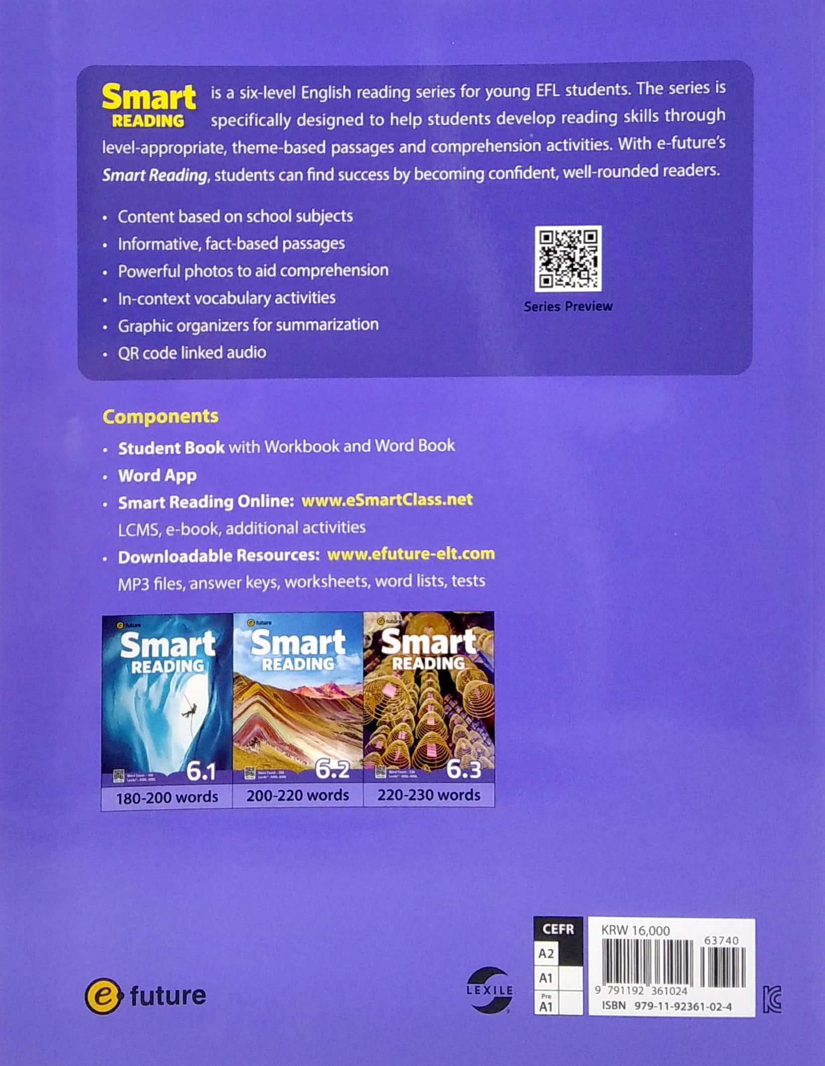 Is a six-level English reading series for young EFL students. The series is specifically designed to help students develop reading skills through level-appropriate, theme-based passages and comprehension activities. With e-future's Smart Reading, students can find success by becoming confident, well-rounded readers.
