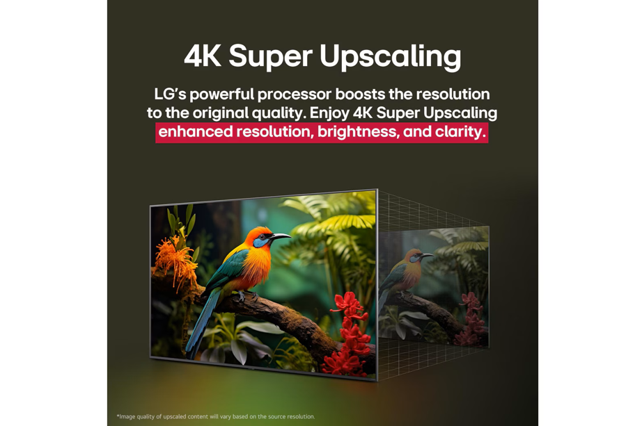 Công nghệ 4K Super Upscaling sử dụng các thuật toán tiên tiến để phân tích và tái tạo các chi tiết bị thiếu trong quá trình nâng cấp, mang đến hình ảnh sắc nét và rõ ràng hơn so với chất lượng gốc. Nhờ vậy, bạn có thể thưởng thức mọi nội dung yêu thích với chất lượng hình ảnh tốt nhất có thể mà không cần lo lắng về chất lượng nguồn phát.