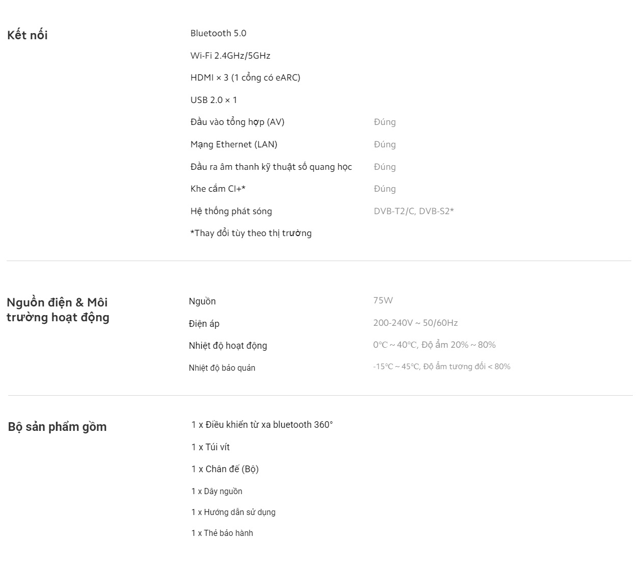ông số cơ bản - Xuất xứ: Việt Nam ông số kỹ thuật - Dòng sản phẩm: 6600 - Kích thước màn hình (inches): 43 - Độ phân giải: 3840*2160 - Góc nhìn:160/150 - HDR