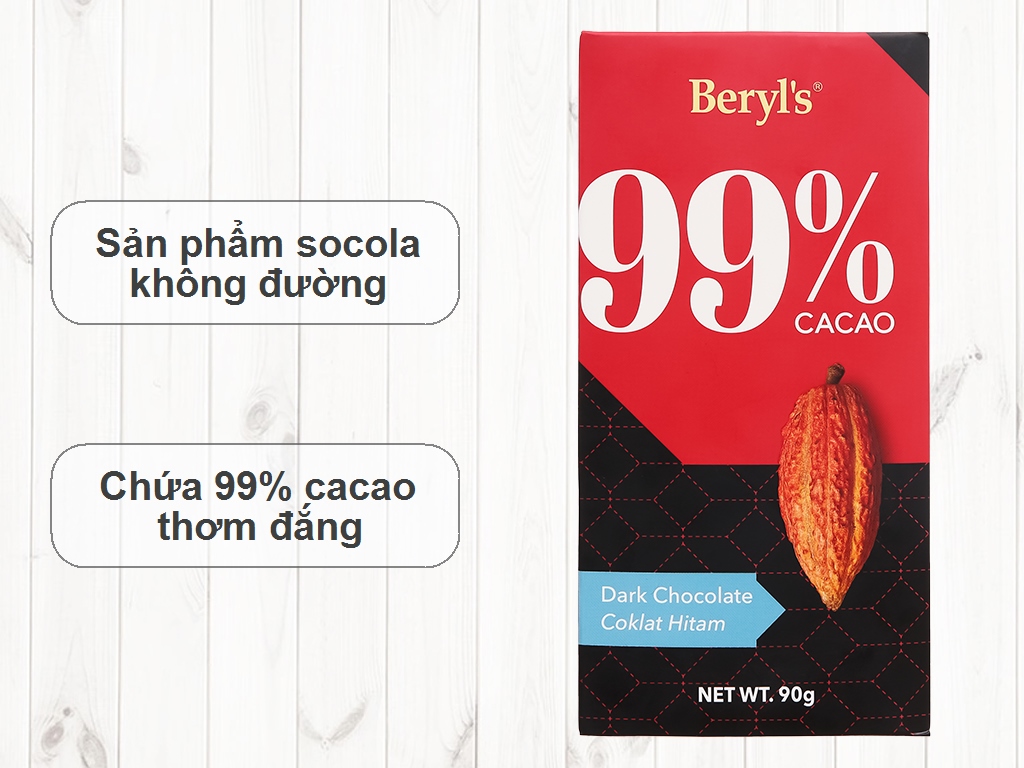 - Socola đắng không đường Beryl's 99% ca cao thanh 90g - - Thương hiệu: Beryls - - Trọng lượng: 90g - - Xuất xứ: Malaysia - - - Hướng dẫn sử dụng: Dùng trực tiếp sau khi mở gói. - - Bảo quản: Bảo quản nơi khô ráo, thoáng mát, tránh ánh nắng trực tiếp. - - Chăm sóc sản phẩm: Bảo quản trong khoảng 18°C - 23°C - - Thành phần: Maltitol, Khối ca cao, bơ ca cao, Bột ca cao, Lecithin đậu nành E322 làm chất nhũ hóa, Vani. Chứa hương liệu cho phép. Chứa chất nhũ hóa như chất điều hòa thực phẩm được phép. - - + Beryl's 99% Cacao Dark Chocolate Bar 90g - - Đối với những người quan tâm đến sức khỏe, thanh sô cô la không thêm đường này là dành cho bạn. Sôcôla Không thêm Đường của chúng tôi được làm ngọt bằng maltitol, vì vậy bạn vẫn có thể thưởng thức các món ăn yêu thích của mình mà không ảnh hưởng đến hương vị. - - Thanh sô cô la đen với 99% cacao sẽ đáp ứng mọi nhu cầu của bạn nếu bạn yêu thích sô cô la đen. Thanh sô cô la này mang vị đắng và hơi ngọt, hoàn hảo cho những người thích sô cô la của họ có vị ngọt nhẹ và đắng.