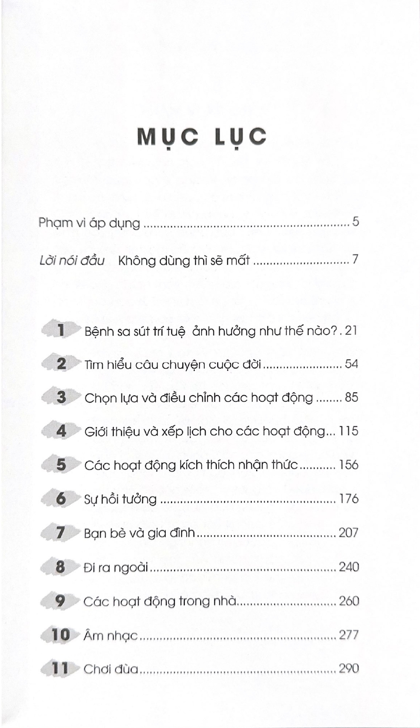 Mua tại TiktokSống An Nhiên Với Chứng Sa Sút Trí Tuệ Tuổi Già Chúng ta luyện tập các cơ để cơ thể khỏe mạnh, mềm dẻo và làm việc tốt hơn. Tương tự, chúng ta cũng cần luyện tập các cơ đầu óc để giữ cho bộ não mạnh khỏe, mềm dẻo và hoạt động hiệu quả. Ngoài ra, chúng ta cũng cần luyện tập các “cơ quan hệ” (mạng lưới xã hội và bạn bè). Đây là tất cả những gì mà cuốn sách này muốn đề cập đến – củng cố và duy trì sức mạnh cho các cơ đầu óc và quan hệ của những người mắc chứng sa sút trí tuệ tuổi già mà bạn đang chăm sóc. Hy vọng rằng, với việc thực hiện các hoạt động đem lại niềm vui cho người sa sút trí tuệ, bạn cũng sẽ cảm thấy hạnh phúc, mãn nguyện, và thông qua việc chia sẻ nụ cười cùng những hoạt động, mối quan hệ của hai người sẽ tiếp tục lớn mạnh.