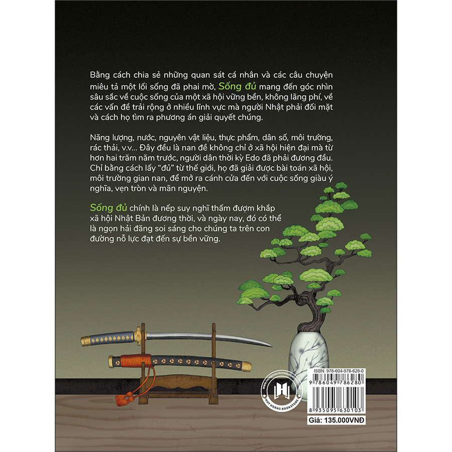 Bằng cách chia sẻ những quan sát cá nhân và các câu chuyện miêu tả một lối sống đã phai mờ, SỐNG ĐỦ mang đến góc nhìn sâu sắc về cuộc sống của một xã hội vững bền, không lãng phí, về các vấn đề trải rộng ở nhiều lĩnh vực mà người Nhật phải đối mặt và cách họ tìm ra phương án giải quyết chúng. Năng lượng, nước, nguyên vật liệu, thực phẩm, dân số, môi trường, rác thải, Đây đều là nan đề không chỉ ở xã hội hiện đại mà từ hơn hai trăm năm trước, người dân thời kỳ Edo đã phải đương đâì. Chỉ bằng cách lấy "đủ" từ thế giới, họ đã giải được bài toán xã hội, môi trường gian nan, để mở ra cánh cửa đến với cuộc sống giàu ý nghĩa, vẹn tròn và mãn nguyện. SỐNG ĐỦ chính là nếp suy nghĩ thấm đượm khắp xã hội Nhật Bản đương thời, và ngày nay, đó có thể là ngọn hải đăng soi sáng cho chúng ta trên con đường nổ lực đạt đến sự bền vững.