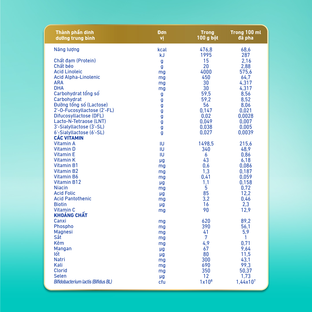 - 100 triệu lợi khuẩn Bifidus BL: lợi khuẩn đặc biệt được chứng minh lâm sàng giúp tăng 200% kháng thể miễn dịch quan trọng nhất trong sữa mẹ (IgA), được nghiên cứu giúp giảm 78% nguy cơ tiêu chảy ở trẻ tập đi.