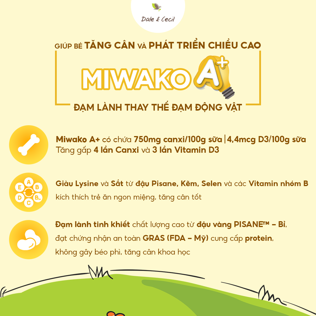 Sữa Miwako A+ được sản xuất bởi Dale & Cecil thông qua những tiêu chuẩn khắt khe: Chứng chỉ Hữu cơ USDA Organic (của bộ Nông nghiệp Mỹ cho các sp có trên 95% thành phần hữu cơ và được tổ chức này theo dõi liên tục quá trình từ sản xuất nguyên liệu thô đến sp cuối cùng). Chứng nhận hữu cơ Châu Âu (Organic EU) tuân thủ quy trình sản xuất thực phẩm bền vững từ đất đai cân bằng và màu mỡ. NON-GMO (Non – Genetically Modified Organism) – Không biến đổi gen. Sản phẩm đạt tiêu chuẩn Non – GMO nghĩa là sản phẩm đó được sản xuất từ 100 % nguyên liệu tự nhiên, tinh khiết, không chứa thành phần biến đổi gen và đảm bảo an toàn cho sức khỏe người sử dụng.