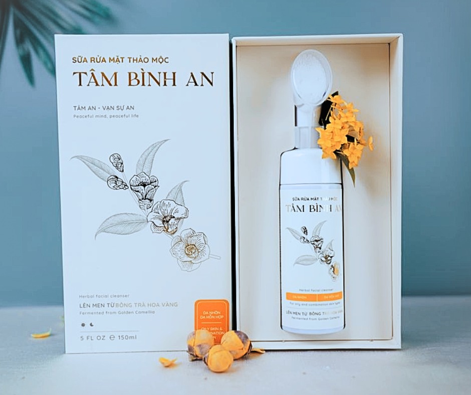 Mua tại TiktokMô tả: Sữa rửa mặt thảo mộc Tâm Bình An gồm các thành phần chủ yếu từ thiên nhiên, chiết xuất từ Trà Hoa Vàng mang tới các công dụng như làm sạch sâu, làm thông thoáng lỗ chân lông, duy trì độ ẩm tự nhiên cho da, chống oxy hóa vượt trội giúp ngăn ngừa mụn trên da, giúp da luôn tươi sáng và mềm mại. Dung tích: 150ml Ưu điểm: An toàn cho da: Đã được kiểm nghiệm da liễu Không chứa hóa chất độc hại, an toàn cho mọi loại da, kể cả da nhạy cảm. Làm sạch cho da hiệu quả: Loại bỏ bụi bẩn, bã nhờn và tế bào chết trên da giúp da thông thoáng và khỏe mạnh. Kích thích sản sinh collagen, giúp da săn chắc, trẻ trung và đàn hồi. Cân bằng độ ẩm cho da: Nhờ chiết xuất từ Trà Hoa Vàng giàu vitamin, khoáng chất và các hợp chất chống oxy hóa, giúp nuôi dưỡng da từ sâu bên trong. Kiểm soát dầu nhờn: Loại bỏ bã nhờn dư thừa trên da, giúp da thông thoáng, ngăn ngừa mụn trứng cá. Thiết kế đầu rửa tạo bọt silicon giúp matxa da mặt, tạo bọt giúp thẩm thấu cho da tốt hơn, tiện lợi, dễ dàng tháo rời vệ sinh. Thành phần: Purified Water, Camellia Chrysantha (Trà Hoa Vàng), Perilla Frutescens Leaf Extract (Chiết xuất Lá Tía Tô), Lactuca indica Root Extract (Chiết xuất Rễ Bồ Công Anh), Saccharomyces/Rice Bran Ferment (Nguyên liệu lên men từ mầm cám Gạo), Ananas Sativus (Pineapple) Fruit Extract (Chiết xuất quả Dứa), Aqua (and) Disodium Cocoyl Glutamate (and) Sodium Cocoyl Glutamate, Hydrolyzed Yeast Protein, Glycerin, Tocopheryl Acetate (Vitamin E), PEG-40 Hydrogenated Castor Oil, Phenoxyethanol (and) Ethylhexylglycerin, Allantoin, Fragrance (Santal 33). KHÔNG CHỨA: SILICON, PARABEN, MÀU TỔNG HỢP, CHẤT CẤM, HÓA CHẤT, MÀI MÒN DA, GÂY TÁC DỤNG PHỤ. Công nghệ lên men tự nhiên giữ dưỡng chất mang lại hiệu quả rõ rệt sau 1-2 tuần sử dụng Công dụng: