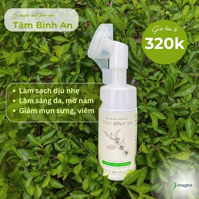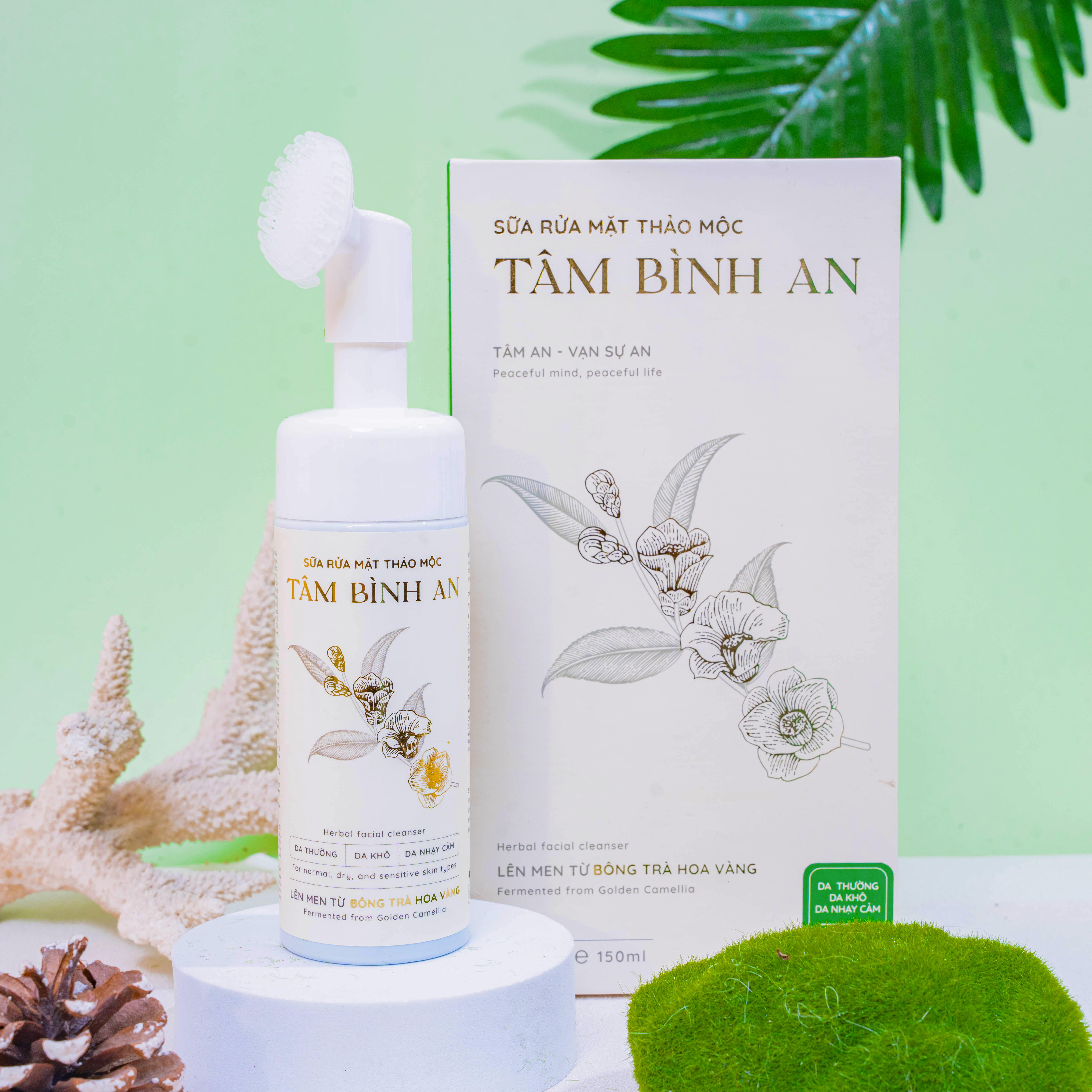 Mua tại TiktokMô tả: Sữa rửa mặt thảo mộc Tâm Bình An gồm các thành phần chủ yếu từ thiên nhiên, chiết xuất từ Trà Hoa Vàng mang tới các công dụng như làm sạch sâu, làm thông thoáng lỗ chân lông, duy trì độ ẩm tự nhiên cho da, chống oxy hóa vượt trội giúp ngăn ngừa mụn trên da, giúp da luôn tươi sáng và mềm mại. Dung tích: 150ml Ưu điểm: An toàn cho da: Đã được kiểm nghiệm da liễu Không chứa hóa chất độc hại, an toàn cho mọi loại da, kể cả da nhạy cảm. Làm sạch cho da hiệu quả: Loại bỏ bụi bẩn, bã nhờn và tế bào chết trên da giúp da thông thoáng và khỏe mạnh. Kích thích sản sinh collagen, giúp da săn chắc, trẻ trung và đàn hồi. Cấp ẩm và dưỡng da mềm mại: Nhờ chiết xuất từ Trà Hoa Vàng giàu vitamin, khoáng chất và các hợp chất chống oxy hóa, giúp nuôi dưỡng da từ sâu bên trong. Kiểm soát dầu nhờn: Loại bỏ bã nhờn dư thừa trên da, giúp da thông thoáng, ngăn ngừa mụn trứng cá. Thiết kế đầu rửa tạo bọt silicon giúp matxa da mặt, tạo bọt giúp thẩm thấu cho da tốt hơn, tiện lợi, dễ dàng tháo rời vệ sinh. Thành phần: Purified Water, Camellia Chrysantha (Trà Hoa Vàng), Perilla Frutescens Leaf Extract (Chiết xuất Lá Tía Tô), Lactuca indica Root Extract (Chiết xuất Rễ Bồ Công Anh), Saccharomyces/Rice Bran Ferment (Nguyên liệu lên men từ mầm cám Gạo), Ananas Sativus (Pineapple) Fruit Extract (Chiết xuất quả Dứa), Aqua (and) Disodium Cocoyl Glutamate (and) Sodium Cocoyl Glutamate, Hydrolyzed Yeast Protein, Glycerin, Tocopheryl Acetate (Vitamin E), PEG-40 Hydrogenated Castor Oil, Phenoxyethanol (and) Ethylhexylglycerin, Allantoin, Fragrance (Santal 33). KHÔNG CHỨA: SILICON, PARABEN, MÀU TỔNG HỢP, CHẤT CẤM, HÓA CHẤT, MÀI MÒN DA, GÂY TÁC DỤNG PHỤ. Công nghệ lên men tự nhiên giữ dưỡng chất mang lại hiệu quả rõ rệt sau 1-2 tuần sử dụng Công dụng: