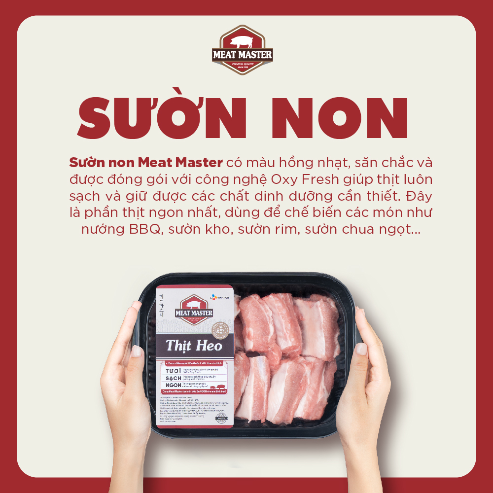 Sườn heo non là phần sườn non được tính từ xương sườn số 5 trở về sau, là phần thịt đặc trưng có nạc, xương sườn nhỏ, dẹt, ít mỡ, thường có sụn ở đầu, được lấy từ phần bụng của heo. Sườn non là một trong những phần hấp dẫn nhất của con heo, được rất nhiều người tiêu dùng ưa chuộng. *** ĐẶT ĐIỂM NỔI BẬT Với mong muốn mang đến cho mỗi gia đình sản phẩm thịt sạch tươi ngon, Thương hiệu thịt mát Meat Master được ra đời dựa trên 3 tiêu chuẩn hoàn hảo đem đến chất lượng cũng như giá trị dinh dưỡng trong mỗi bữa ăn của gia đình bạn: