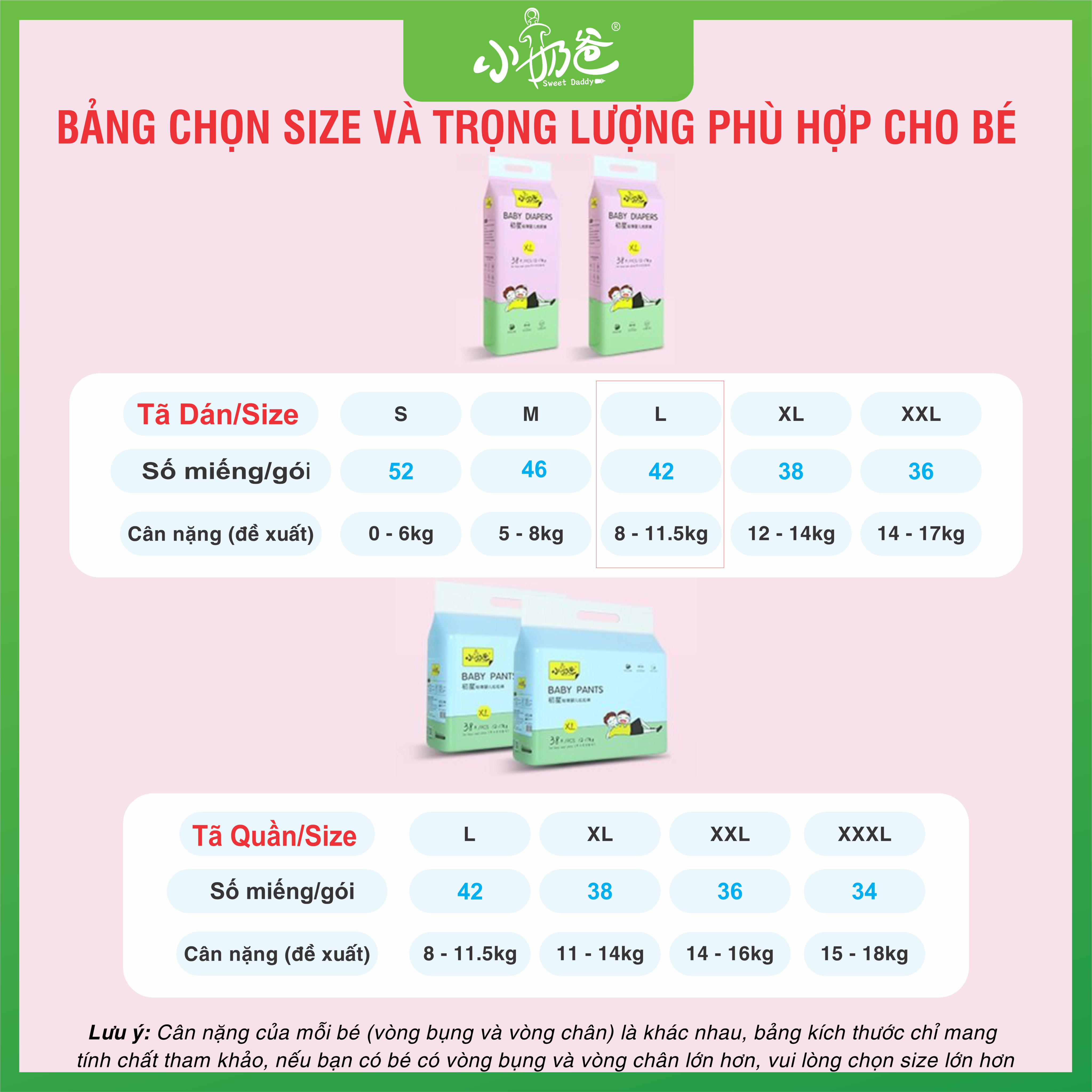 - 8 Thành phần và tính năng nổi bật của SWEET DADDY: 1/ SIÊU THẤM HÚT: Sweet Daddy sử dụng cấu trúc lõi đầy đủ 5 lớp composite với 430g lõi hấp thụ. Lớp trên sử dụng SAN-DIA SAP nhập khẩu của Nhật Bản để khóa nước mạnh mẽ và không bao giờ thẩm thấu ngược. Và lớp dưới sử dụng SUMITOMO SAP hút nước, để hút nước cực nhanh và lan tỏa nước nhanh giữ khô ráo. 2/ SIÊU MỎNG: Thiết kế độc đáo chỉ mỏng dưới 2mm giúp bé thoải mái vận động, không lo chân chữ O. 3/ SIÊU MỀM: Lớp bề mặt ngọc trai 3D lồi lõm với 5000 lỗ thông hơi 3D nano, tăng cường khả năng thông gió, diện tích hấp thụ lớn hơn, hấp thụ chất lỏng nhanh hơn, thiết kế lồi-lõm giúp hấp thụ nước tiểu chính xác hơn, không bị rò rỉ sang một bên, khả năng hấp thụ phân mạnh hơn và dễ khuếch tán hơn. Giữ cho mông trẻ luôn khô ráo, siêu mềm mại, không gây kích ứng, chống đỏ mông cho bé. 4/ SIÊU CẢI TIẾN: Lõi treo công nghệ hình chữ U cải tiến, diện tích hấp thụ mở rộng, tốc độ dẫn dòng được đẩy nhanh, không thấm ngược, không vón cục, tạo lớp liên tục, cho bé cảm giác khô thoáng nhất. 5/ SIÊU CO GIÃN: Thiết kế cải tiến lưng thun siêu co giãn 360 độ, có chun co giãn 2 đầu vừa đủ để không làm hằn rốn tạo cảm giác mềm mại như vòng tay mẹ ôm ấp mang đến cho bé sự nâng niu thân mật nhất 6/ SIÊU BẢO VỆ: Thiết kế 2 lớp chống rò rỉ đàn hồi thông minh 3D, bảo vệ hoàn toàn, không làm bó chân, 100% chống rò rỉ 2 bên. 7/ SIÊU THOÁNG KHÍ: Sử dụng màng đáy mềm và mịn bằng vải lụa nhập khẩu, chứa hàng chục triệu lỗ chân lông siêu thoáng khí, thoát ẩm nhanh chóng giúp da không bị kích ứng. Cap lưng cao giúp chống tràn cho bé khi đi tiểu nhiều. 8/ SIÊU AN TOÀN: Không chất huỳnh quang, formaldehyde, không kích thích, không gây dị ứng. -SWEET DADDY CAM KẾT: