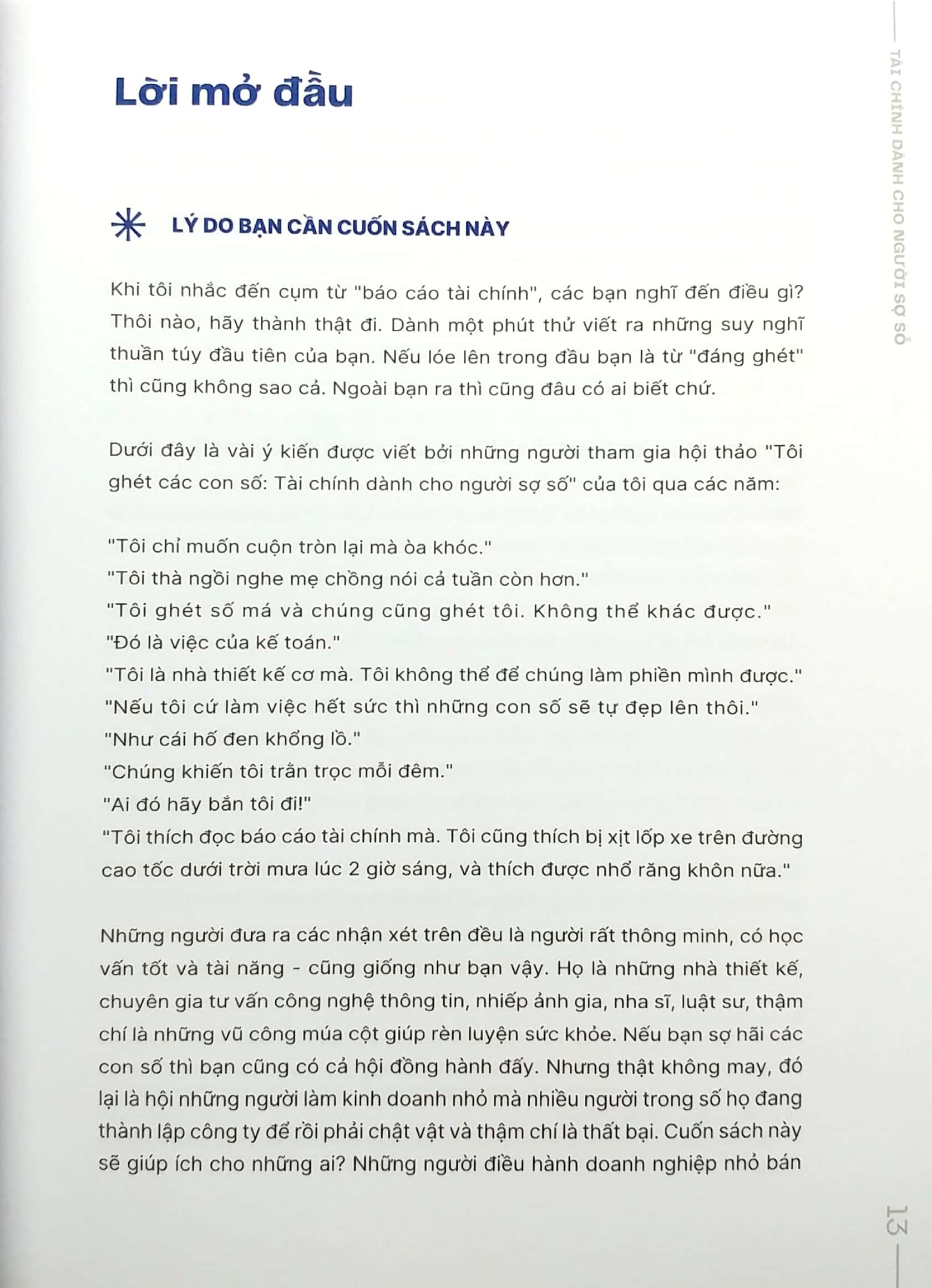 “TÀI CHÍNH DÀNH CHO NGƯỜI SỢ SỐ" là cuốn sách dễ hiểu, mạch lạc và thú vị nhất về tài chính cho các doanh nghiệp vừa và nhỏ. Cuốn sách sẽ giúp bạn đọc hiểu ý nghĩa của các con số trong bảng báo cáo tài chính từ đó nhận ra được chính xác tình hình kinh doanh và đưa ra các quyết định quản lý, điều chỉnh quan trọng đưa doanh nghiệp cải thiện khả năng sinh lời.