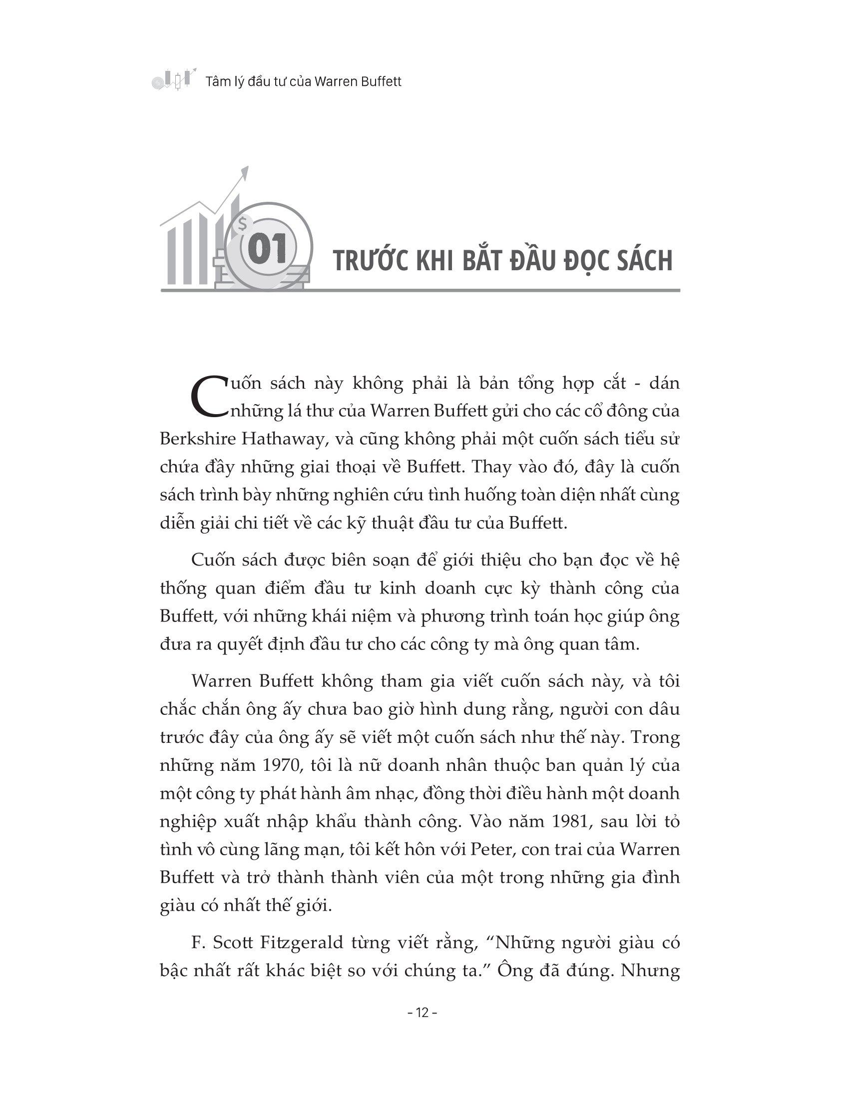 Trong giới đầu tư, Warren Buffett nổi lên như một huyền thoại với triết lý đầu tư ấn tượng. Chỉ từ số vốn ít ỏi ban đầu, Buffett đã tích lũy được khối tài sản khổng lồ biến ông trở thành 1% người giàu có nhất thế giới. Cuốn sách này chính là bản hướng dẫn đầu tư độc nhất vô nhị giải thích các chiến lược chiến thắng của ông, được viết bởi Mary Buffett, con dâu cũ của thiên tài tài chính huyền thoại này và là một nữ doanh nhân thành đạt, hợp tác cùng David Clare.