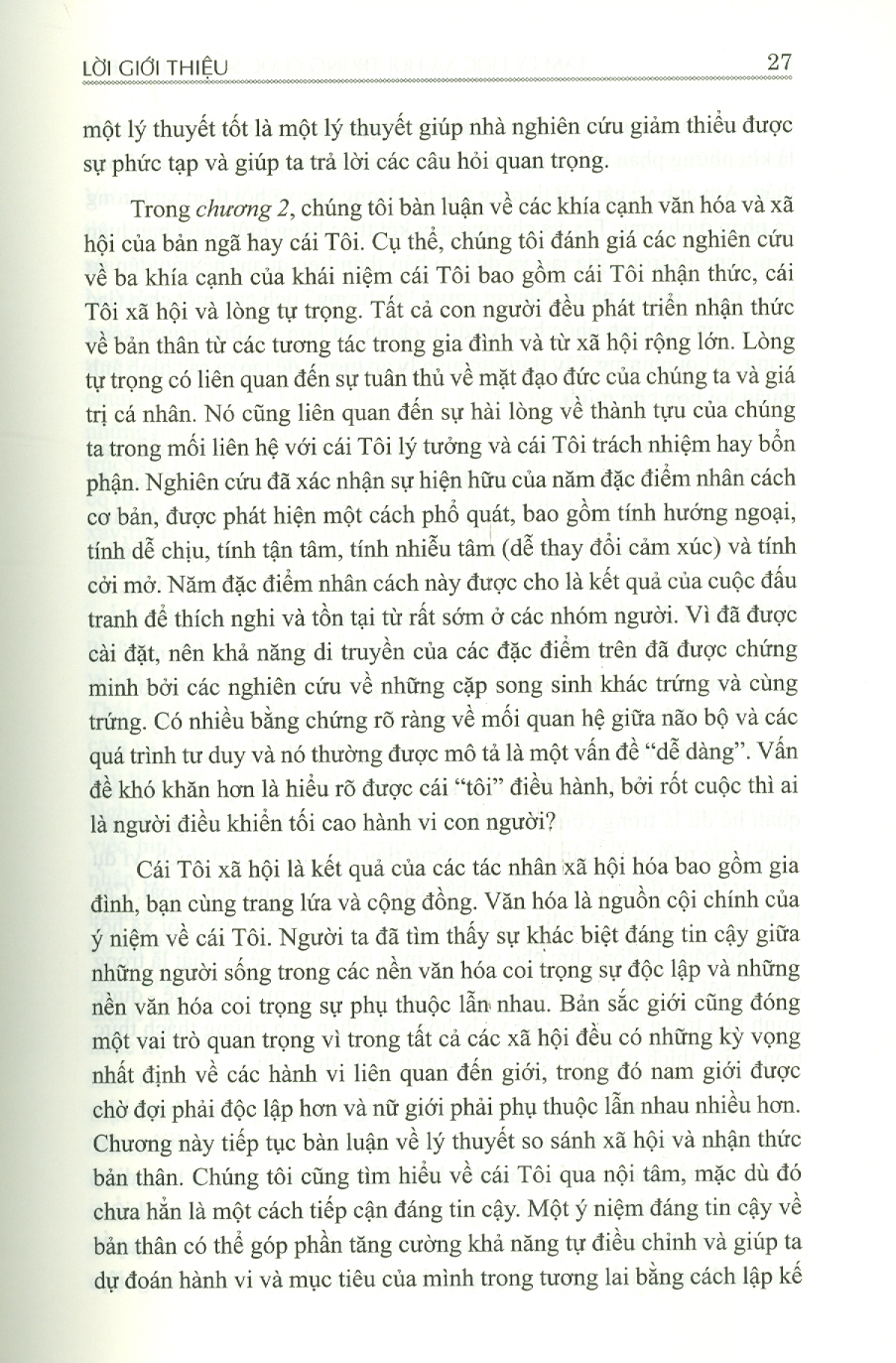 Cuốn sách gồm 11 chương: Chương 1: chuyên ngành tâm lý học xã hội Chương 2: Cái tôi nhìn từ góc độ văn hóa và xã hội Chương 3: Sự hấp dẫn và các mối
