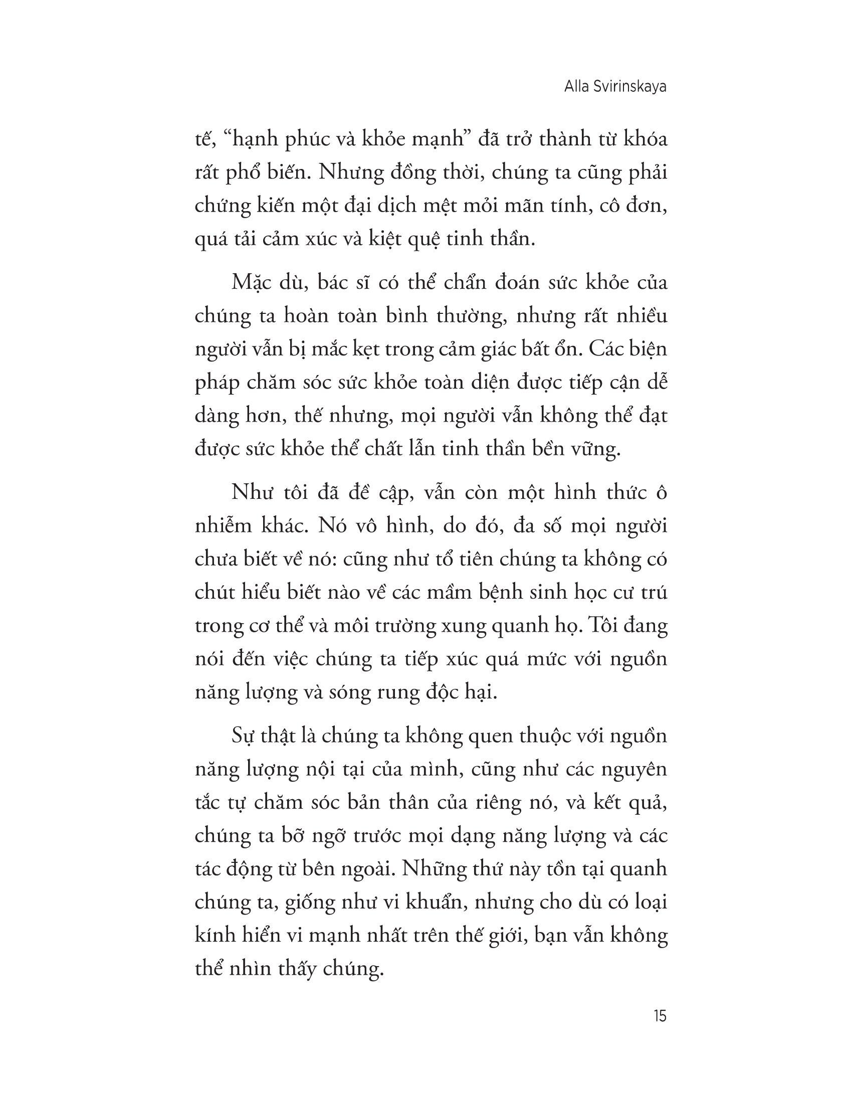 Trong Tần số rung động cảm xúc cá nhân, Alla Svirinskaya khám phá lý do tiềm ẩn đằng sau sự mất mát năng lượng và sự suy giảm sức khỏe của chúng ta. Tất cả mọi người đều mang trong m.ình một vầng hào quang tương ứng với các tần số rung động.