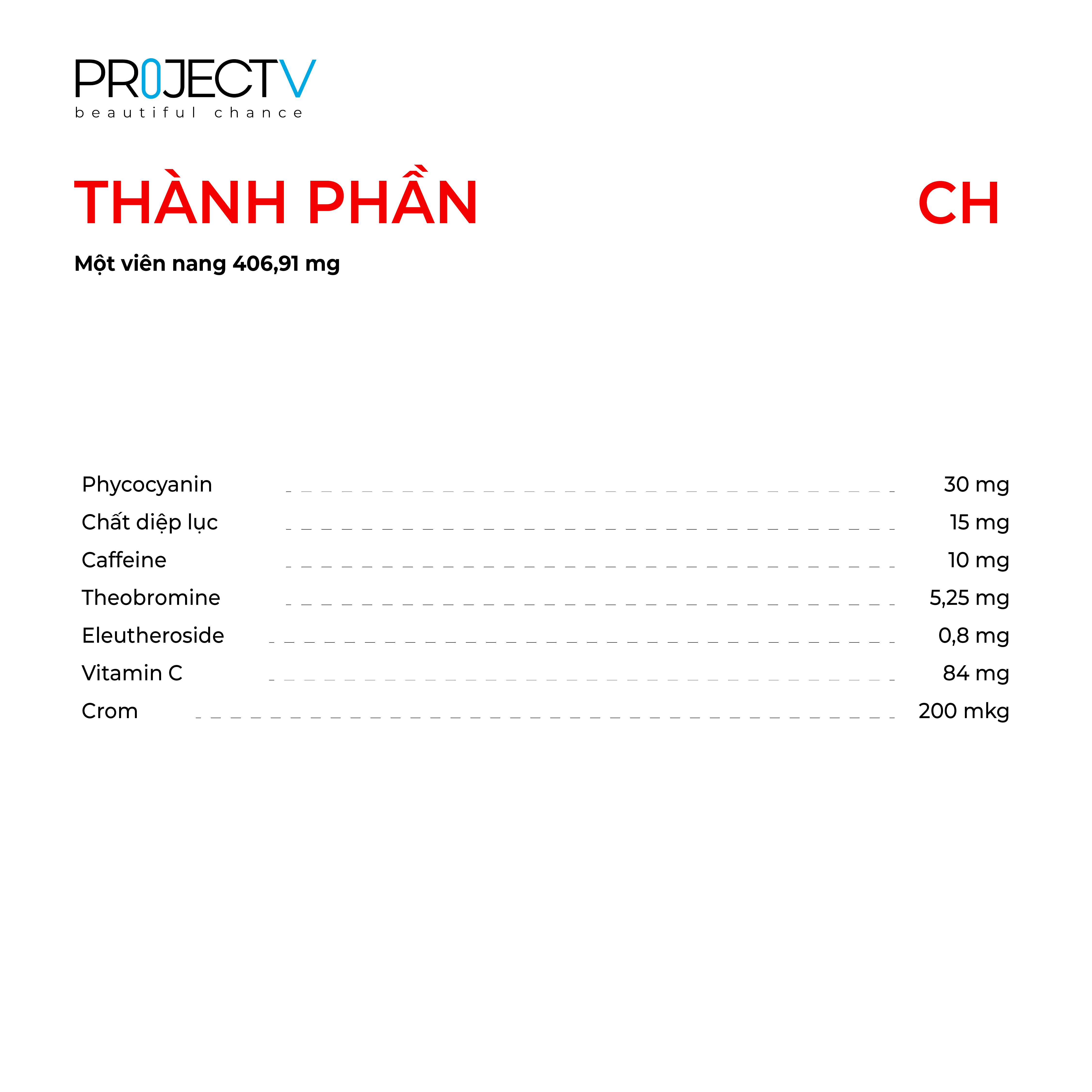 CH - chứa 150mg vi tảo spirulina trong mỗi viên nang. Khi uống hàng ngày, CH góp phần hình thành cảm giác hài lòng, giảm căng thẳng thần kinh, giúp cơ thể săn chắc và tăng cường hệ miễn dịch.