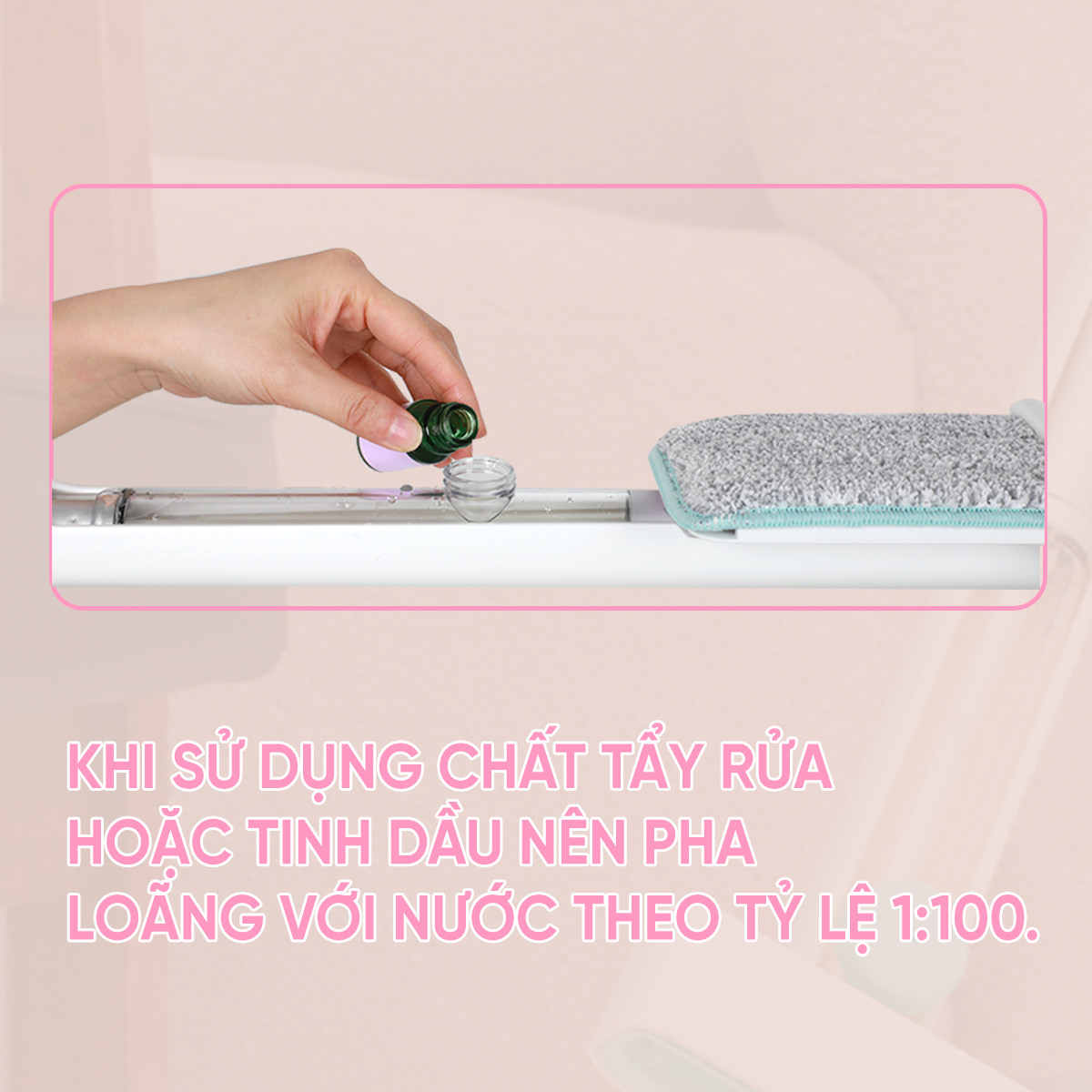 Thiết kế bình khoang chứa nước thông minh, nằm gọn trong cán lau nhà , không bị vướng khi kéo đẩy thanh gạt