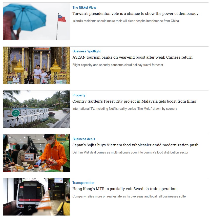 Nikkei Asia là tạp chí tiếng Anh có tên tuổi thuộc tập đoàn Nikkei - Nhật Bản, chuyên viết về những xu hướng kinh tế, công nghệ, chính trị của các nước trong khu vực châu Á - Thái Bình Dương gồm có Việt Nam. Ngoài ra còn cung cấp các phân tích từ chuyên gia, nhà báo về đời sống và văn hóa các nước châu Á. (Trending, Business, Markets,Tech, Politics, Economy, Features, Opinion, Life & Arts).