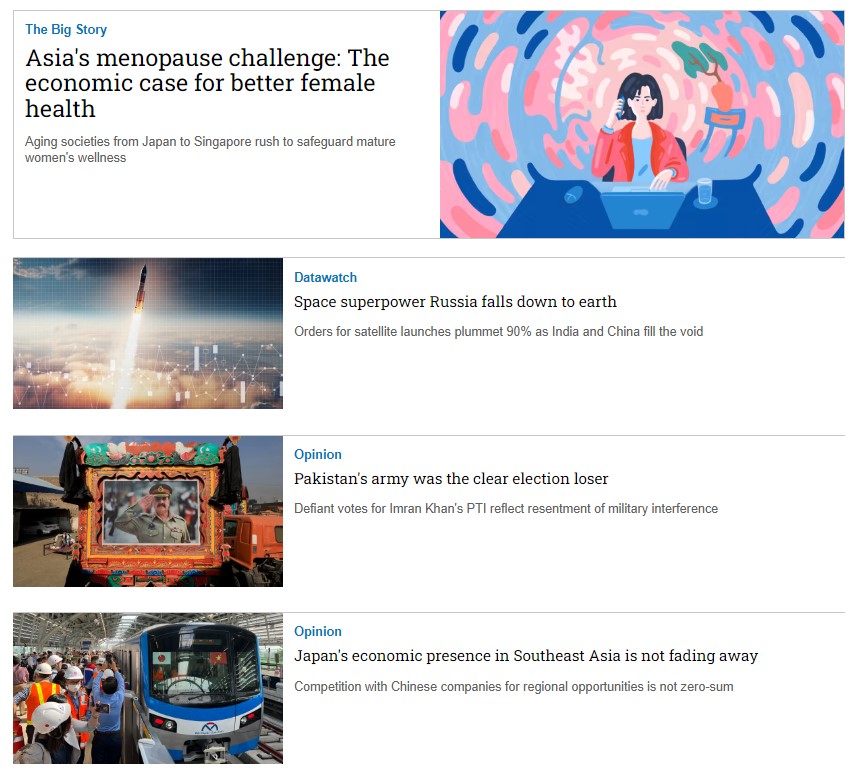 Nikkei Asia là tạp chí tiếng Anh có tên tuổi thuộc tập đoàn Nikkei - Nhật Bản, chuyên viết về những xu hướng kinh tế, công nghệ, chính trị của các nước trong khu vực châu Á - Thái Bình Dương gồm có Việt Nam. Ngoài ra còn cung cấp các phân tích từ chuyên gia, nhà báo về đời sống và văn hóa các nước châu Á. (Trending, Business, Markets,Tech, Politics, Economy, Features, Opinion, Life & Arts).