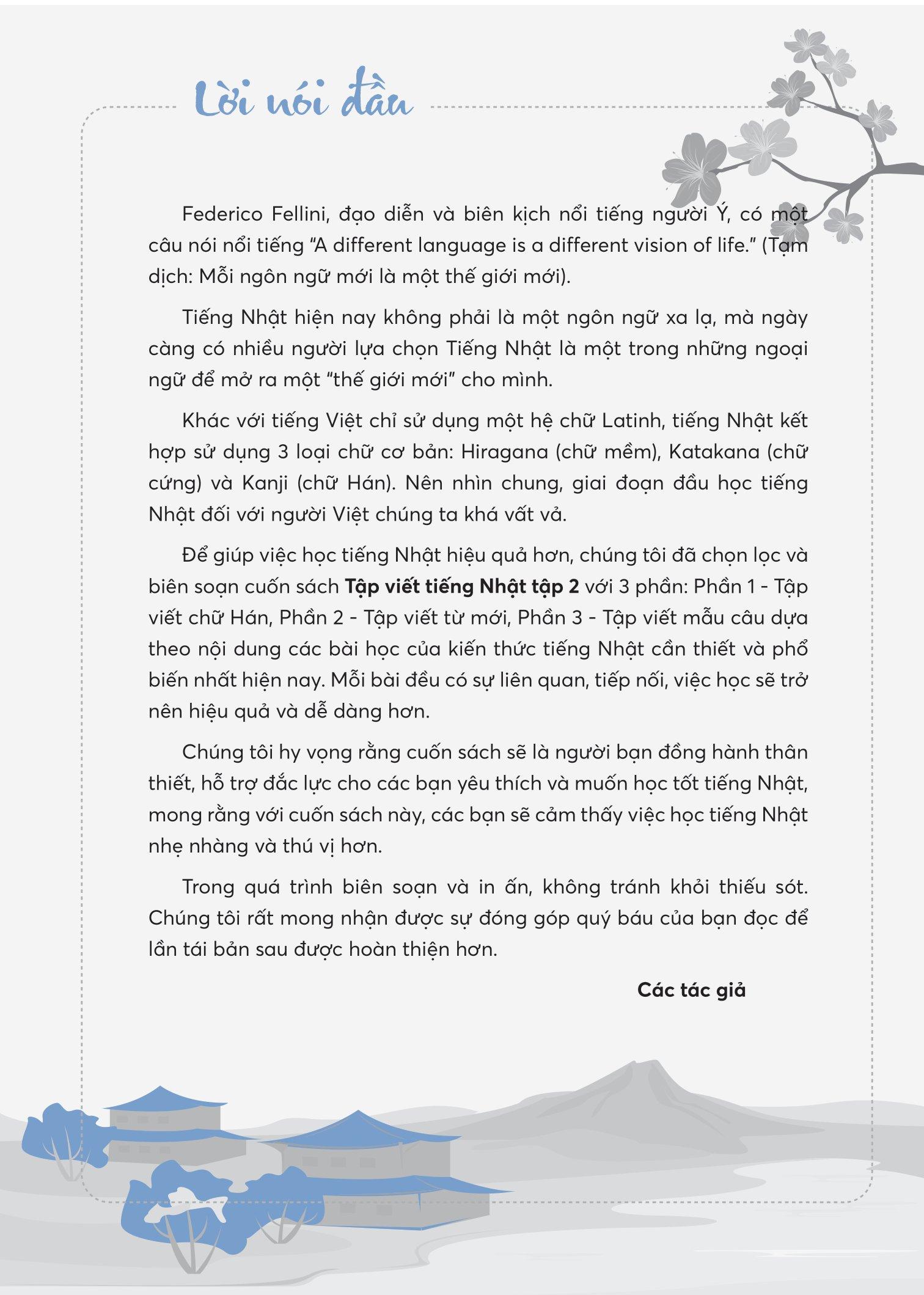 “Tập viết tiếng Nhật tập 2” là cuốn sách hữu ích cho người học ở trình độ cơ bản, giúp bạn học có một khởi đầu tốt và nền tảng vững chắc cho quá trình học tiếng Nhật. Cuốn sách được viết bởi các tác giả có kinh nghiệm trong việc giảng dạy tiếng Nhật cho người Việt; được thiết kế đơn giản, dễ hiểu, cung cấp đầy đủ kiến thức về viết chữ Hán, chữ Hiragana và chữ Katakana.