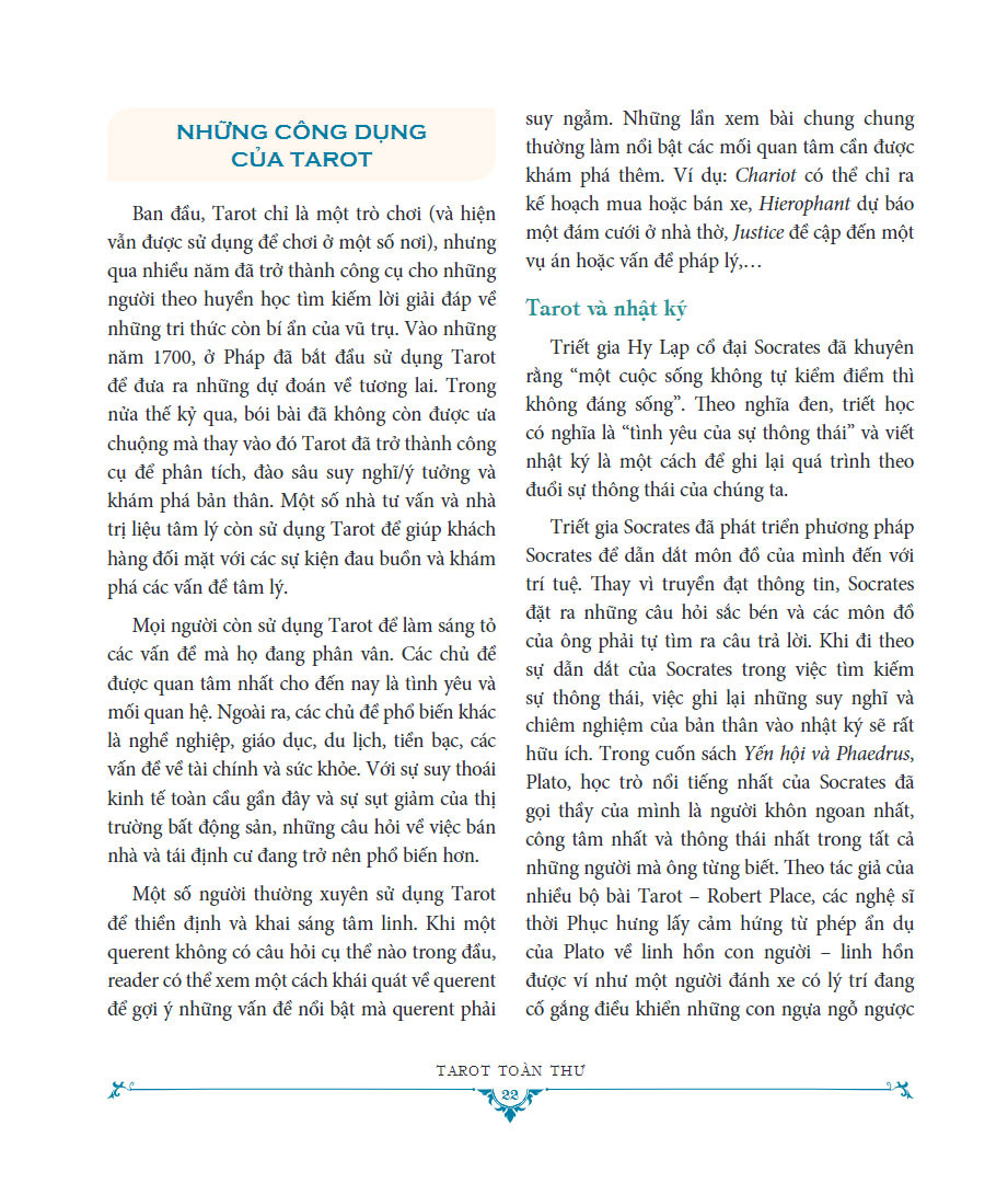 • Cuốn sách này sẽ trình bày vấn đề cốt lõi của Tarot theo cách mới mẻ và thú vị, tránh viết lại những gì đã có trên thị trường rồi.