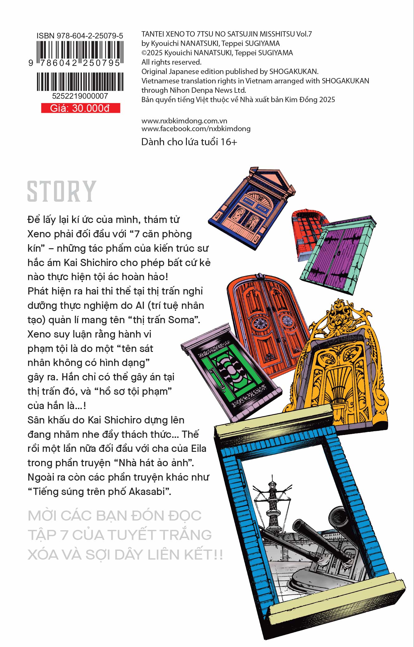 Để lấy lại kí ức của mình, thám tử Xeno phải đối đầu với “7 căn phòng kín” – những tác phẩm của kiến trúc sư hắc ám Kai Shichiro cho phép bất cứ kẻ nào thực hiện tội ác hoàn hảo! Phát hiện ra hai thi thể tại thị trấn nghỉ dưỡng thực nghiệm do AI (trí tuệ nhân tạo) quản lí mang tên “thị trấn Soma”. Xeno suy luận rằng hành vi phạm tội là do một “tên sát nhân không có hình dạng” gây ra. Hắn chỉ có thể gây án tại thị trấn đó, và “hồ sơ tội phạm” của hắn là…! Sân khấu do Kai Shichiro dựng lên đang nhăm nhe đầy thách thức… Thế rồi một lần nữa đối đầu với cha của Eila trong phần truyện “Nhà hát ảo ảnh”. Ngoài ra còn các phần truyện khác như “Tiếng súng trên phố Akasabi”. MỜI CÁC BẠN ĐÓN ĐỌC TẬP 7 CỦA TUYẾT TRẮNG XÓA VÀ SỢI DÂY LIÊN KẾT!!