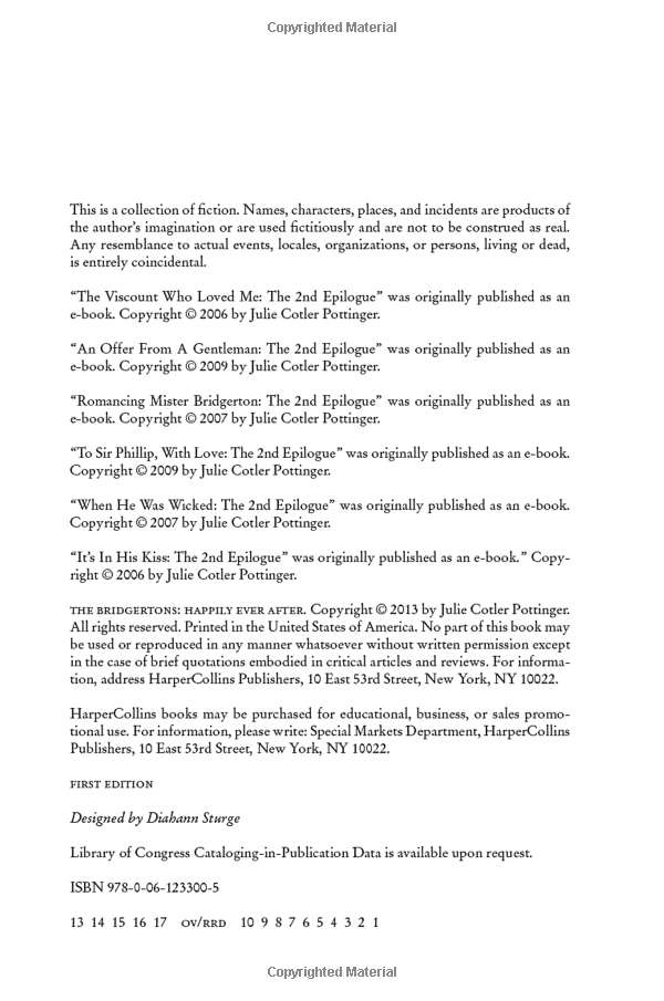 Also unique to this volume is a novella featuring Violet Bridgerton, beloved mother of the eight Bridgerton siblings, in addition to second epilogues for The Duke and I; The Viscount Who Loved Me; An Offer from a Gentleman; Romancing Mister Bridgerton; To Sir Phillip, With Love; When He Was Wicked, It’s in His Kiss; and On the Way to the Wedding sure to satisfy the legions of Julia Quinn fans.