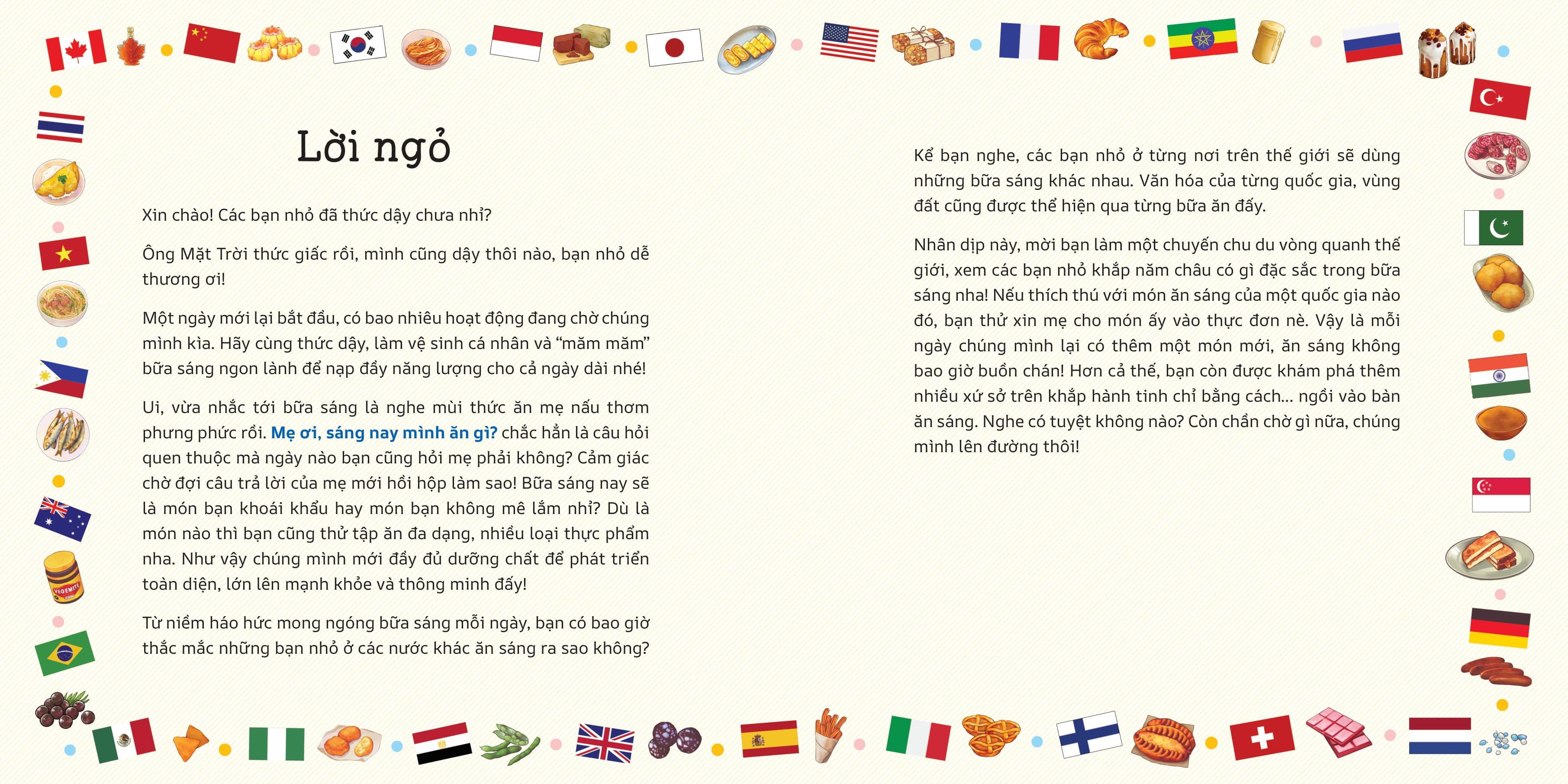Mua tại TiktokThế Giới Lớn Trong Bàn Tay Nhỏ - Mẹ Ơi, Sáng Nay Mình Ăn Gì? Bạn có biết trẻ em ở các nước trên thế giới ăn món gì trong bữa sáng không? Bạn có biết bữa sáng ở Hà Lan là bánh mì rắc cốm màu sắc vui nhộn, còn người Thái Lan thờ nữ thần lúa nên bữa ăn chẳng bao giờ thiếu gạo? Bạn có biết món bơ ăn sáng đã đi vào lời ăn tiếng nói của người Úc, còn người Mĩ bận rộn đã phát kiến ra bữa sáng cất trong túi áo? Mẹ ơi, sáng nay m.ình ăn gì? Đưa bạn chu du khắp năm châu, nếm thử nhiều bữa sáng, khám phá nét văn hóa độc đáo của các xứ sở. Bạn sẽ nhận ra mỗi bữa ăn đều chứa đựng vô số câu chuyện thú vị. Hãy cùng thưởng thức các món ăn sáng ngon tuyệt trong quyển sách này bạn nha!