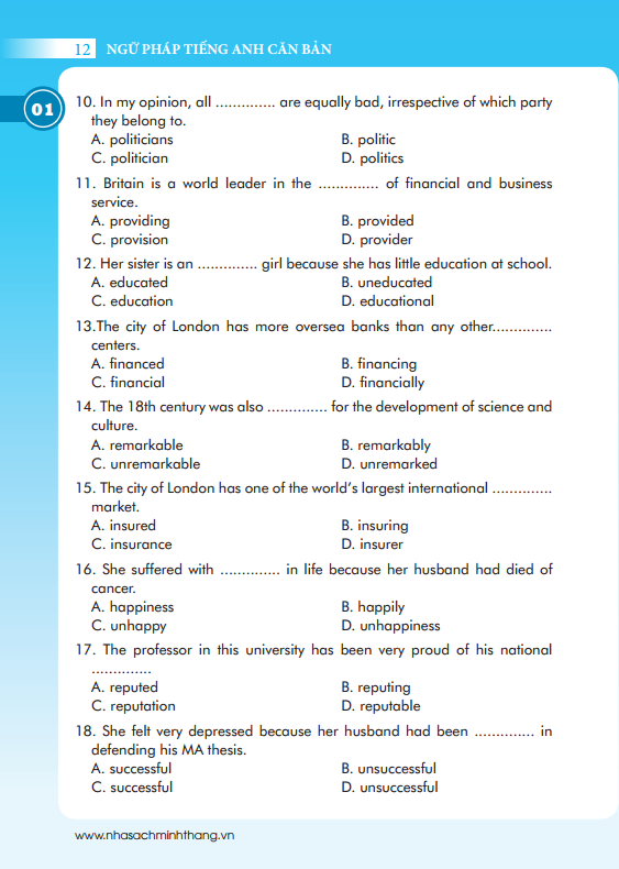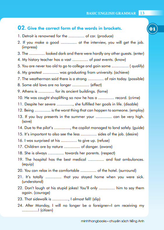 Cuốn sách Ngữ pháp cơ bản được xây dựng từ 21 chủ điếm ngữ pháp thiết yếu nhất, cơ bản nhất của tiếng Anh dành cho người mới bắt đầu tiếp cận tiếng Anh: danh từ, động từ, tính từ, trạng từ, giới từ, thì, các dạng số sánh,