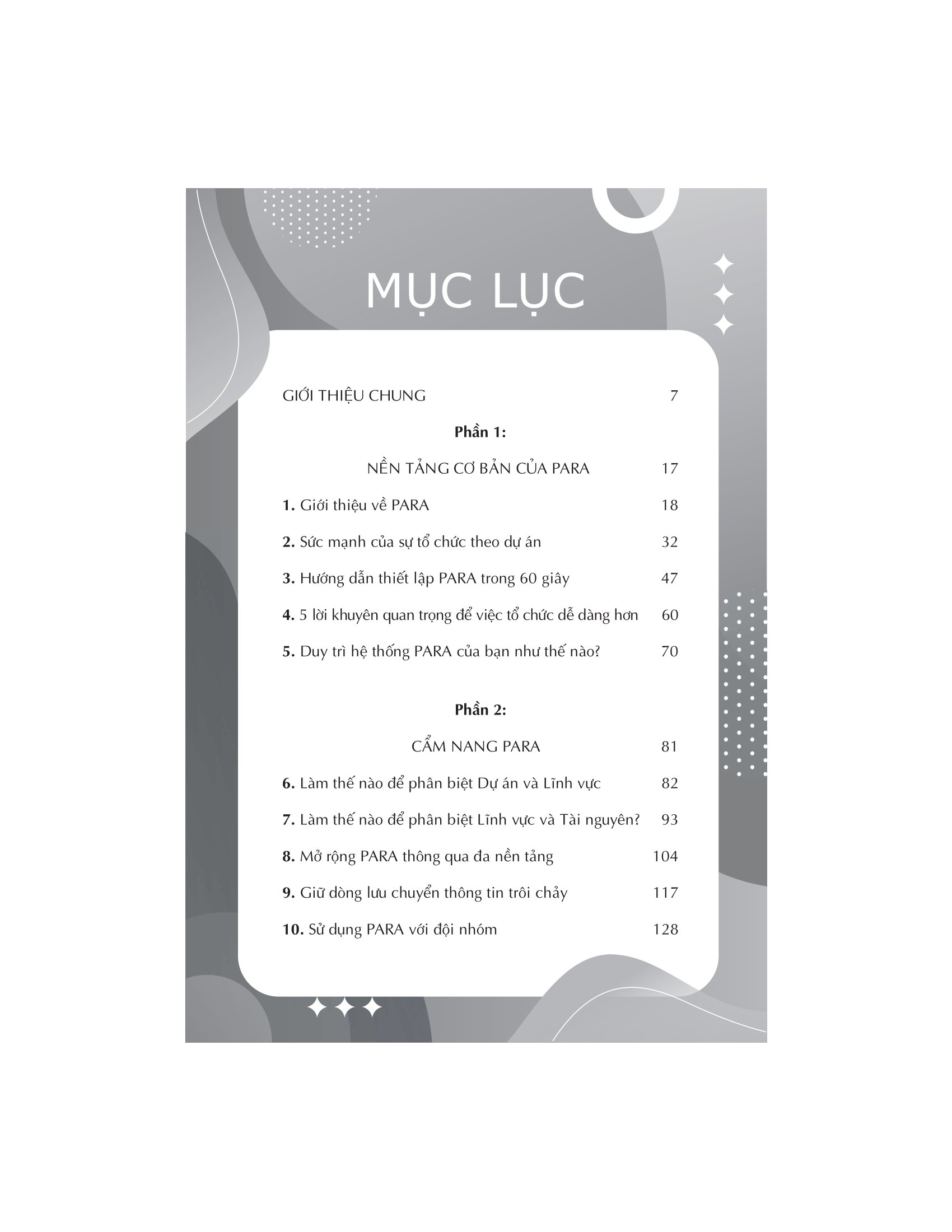 Với cách viết dễ hiểu và hấp dẫn, tác giả Tiago Forte phác thảo các phương pháp hay nhất và mẹo về cách triển khai PARA thành công, cùng với việc tìm hiểu sâu về mọi thứ, từ cách áp dụng thói quen để luôn ngăn nắp cho đến cách sử dụng hệ thống này để nâng cao sự tập trung của bạn. Phương pháp PARA có thể được triển khai chỉ trong vài giây nhưng có khả năng biến đổi quỹ đạo công việc và cuộc sống của bạn bằng cách sử dụng sức mạnh của tổ chức kỹ thuật số.