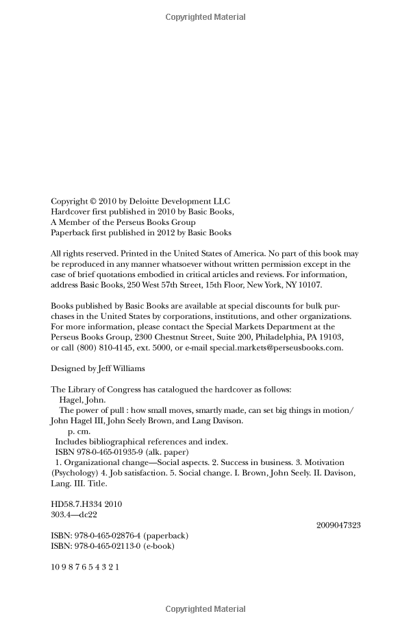In a radical break with the past, information now flows like water, and we must learn how to tap into its stream. Individuals and companies can no longer rely on the stocks of knowledge that they've carefully built up and stored away. Information now flows like water, and we must learn how to tap into the stream. But many of us remain stuck in old practices- practices that could undermine us as we search for success and meaning. In this revolutionary book, three doyens of the Internet age, whose path-breaking work has made headlines around the world, reveal the adjustments we must make if we take these changes seriously. In a world of increasing risk and opportunity, we must understand the importance of pull . Understood and used properly, the power of pull can draw out the best in people and institutions by connecting them in ways that increase understanding and effectiveness. Pull can turn uncertainty into opportunity, and enable small moves to achieve outsized impact. Drawing on pioneering research, The Power of Pull shows how to apply its principles to unlock the hidden potential of individuals and organizations, and how to use it as a force for social change and the development of creative talent. The authors explore how to use the power of pull to: Access new sources of information Attract likeminded individuals from around the world Shape serendipity to increase the likelihood of positive chance encounters Form creation spaces to drive you and your colleagues to new heights Transform your organization to adapt to the flow of knowledge The Power of Pull is essential reading for entrepreneurs, managers, and anybody interested in understanding and harnessing the shifting forces of our networked world.