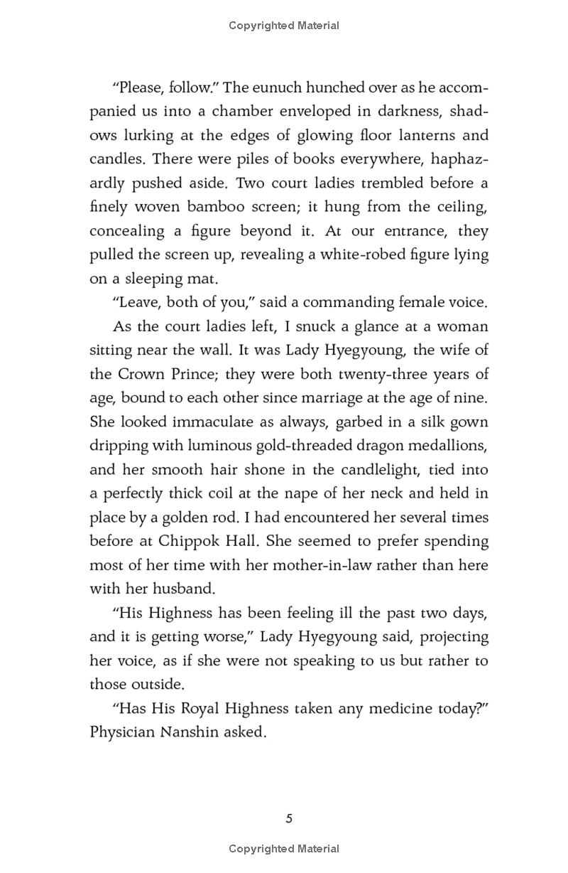 Joseon (Korea), 1758. There are few options available to illegitimate daughters in the capital city, but through hard work and study, eighteen-year-old Hyeon has earned a position as a palace nurse. All she wants is to keep her head down, do a good job, and perhaps finally win her estranged father's approval.