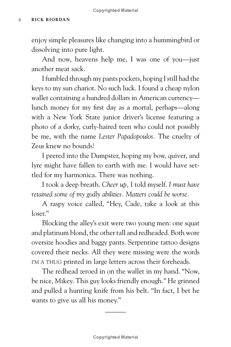 How do you punish an immortal?By making him human.After angering his father Zeus, the god Apollo is cast down from Olympus. Weak and disoriented, he lands in New York City as a regular teenage boy. Now, without his godly powers, the four-thousand-year-old deity must learn to survive in the modern world until he can somehow find a way to regain Zeus's favor.But Apollo has many enemies-gods, monsters, and mortals who would love to see the former Olympian permanently destroyed. Apollo needs help, and he can think of only one place to go . . . an enclave of modern demigods known as Camp Half-Blood.Also included, a bonus short story: "Percy Jackson and the Singer of Apollo"