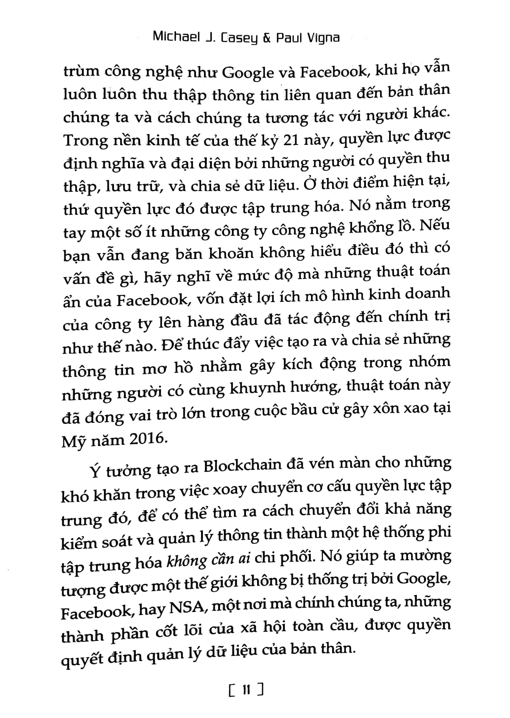 Vậy, điều gì sẽ xảy ra nếu quyền lực được phân tán, mọi cá nhân đều có quyền ngang nhau trong việc quản lý thông tin, và không một chính phủ, một đại doanh nghiệp nào có quyền chi phối tuyệt đối? Điều đó sẽ thành hiện thực với sự xuất hiện của Blockchain - "cỗ máy sự thật". Blockchain giúp ta hình dung ra một thế giới không bị thống trị bởi Google, Facebook, hay NSA - một nơi mà chính mỗi chúng ta, những thành phần cốt lõi của xã hội toàn cầu, được quyền quyết định quản lý dữ liệu của bản thân.