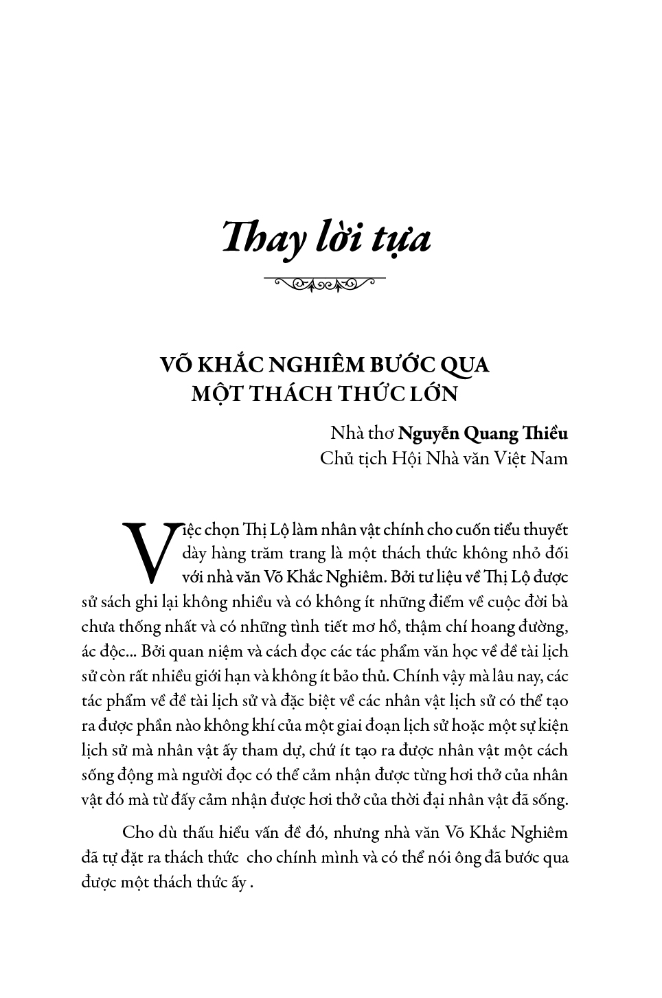 Việc chọn Thị Lộ làm nhân vật chính cho cuốn tiểu thuyết dày gần hàng trăm trang là một thách thức không nhỏ đối với nhà văn Võ Khắc Nghiêm. Bởi tư liệu về Thị Lộ được sử sách ghi lại không nhiều và có không ít những điểm về cuộc đời bà chưa thống nhất và có những tình tiết mơ hồ ,thậm chí hoang đường, ác độc… Bởi quan niệm và cách đọc các tác phẩm văn học về đề tài lịch cử còn rất nhiều giới hạn và không ít bảo thủ. Chính vậy mà lâu nay, các tác phẩm về đề tài lịch sử và đặc biệt về các nhân vật lịch sử có thể tạo ra được phần nào không khí của một giai đoạn lịch sử hoặc một sự kiện lịch sử mà nhân vật ấy tham dự, chứ ít tạo ra được nhân vật một cách sống động mà người đọc có thể cảm nhận được từng hơi thở của nhân vật đó mà từ đấy cảm nhận được hơi thở của thời đại nhân vật đã sống.
