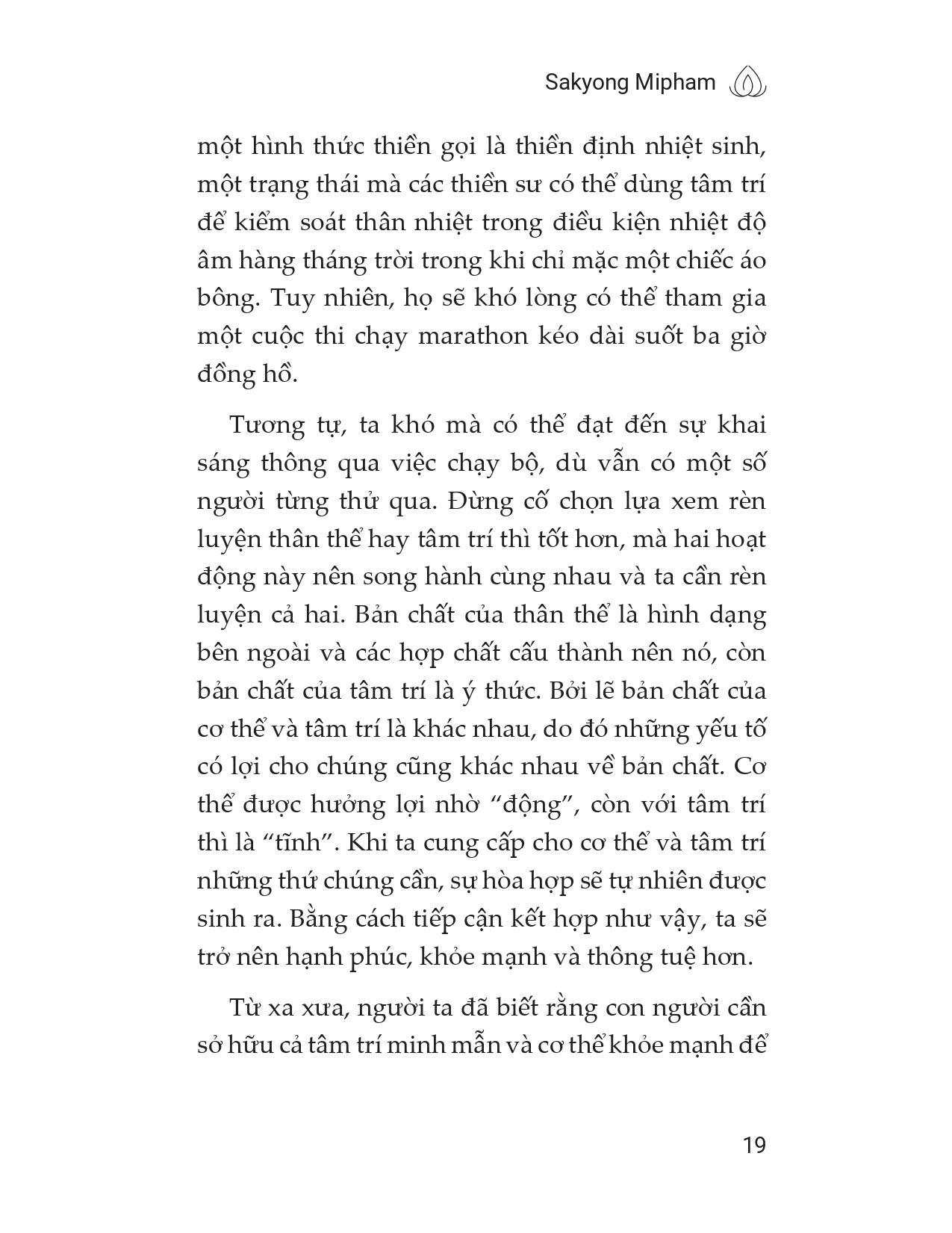 Là một Lạt ma Tây Tạng và là lãnh đạo của Shambhala (một cộng đồng quốc tế gồm 165 trung tâm thiền định), Sakyong Mipham nhận thấy hoạt động thể chất là điều cần thiết cho sức khỏe tinh thần. Dù được đào tạo về cưỡi ngựa và võ thuật, nhưng ngài lại có tình yêu đặc biệt với chạy. Trong cuốn sách này, ngài đã trình bày về quá trình kết hợp chạy bộ với việc thực hành tâm linh, đưa ra những hướng dẫn và nguyên tắc thiền cơ bản mà mình đã phát triển. Dù đây là hai hoạt động phức tạp, nhưng các bài học trong cuốn sách này lại rất đơn giản và được thiết kế để chỉ ra rằng tất cả mọi người - bất kể tuổi tác, nền tảng tinh thần hoặc khả năng - đều có thể kết hợp giữa thực hành nội tâm với vận động cơ thể, nhằm mang lại lợi ích cho cơ thể và tâm hồn.