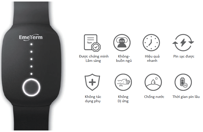 EmeTerm được chứng minh có hiệu quả lâm sàng (clinical proven), nó là thiết bị điện tử y tế nên có thể sạc lại để dùng cho lần sau nên không cần dùng bất kỳ thuốc uống hoặc hoá dược thấm qua da như thông thường nên không có tác dụng phụ và an toàn cho phụ nữ mang thai.