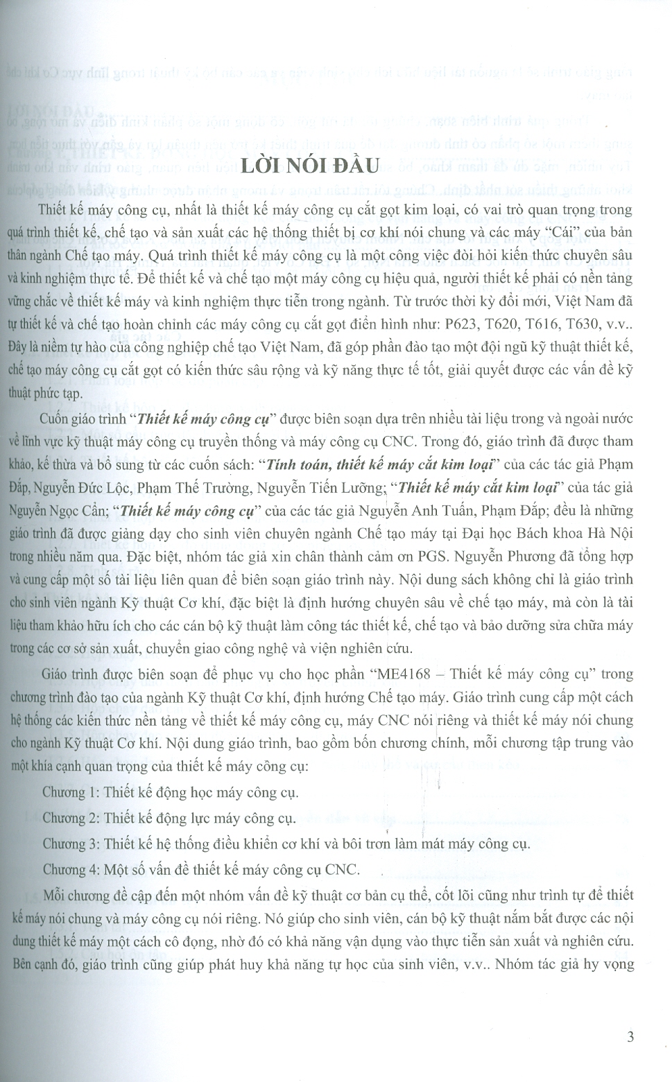 Cuốn giáo trình “Thiết kế máy công cụ” được biên soạn dựa trên nhiều tài liệu trong và ngoài nước về lĩnh vực kỹ thuật máy công cụ truyền thống và máy công cụ CNC. Trong đó, giáo trình đã được tham khảo, kế thừa và bổ sung từ các cuốn sách: “Tính toán, thiết kế máy cắt kim loại” của các tác giả Phạm Đắp, Nguyễn Đức Lộc, Phạm Thế Trường, Nguyễn Tiến Lưỡng; “Thiết kế máy cắt kim loại” của tác giả Nguyễn Ngọc Cẩn; “Thiết kế máy công cụ” của các tác giả Nguyễn Anh Tuấn, Phạm Đắp; đều là những giáo trình đã được giảng dạy cho sinh viên chuyên ngành Chế tạo máy tại Đại học Bách khoa Hà Nội trong nhiều năm qua.
