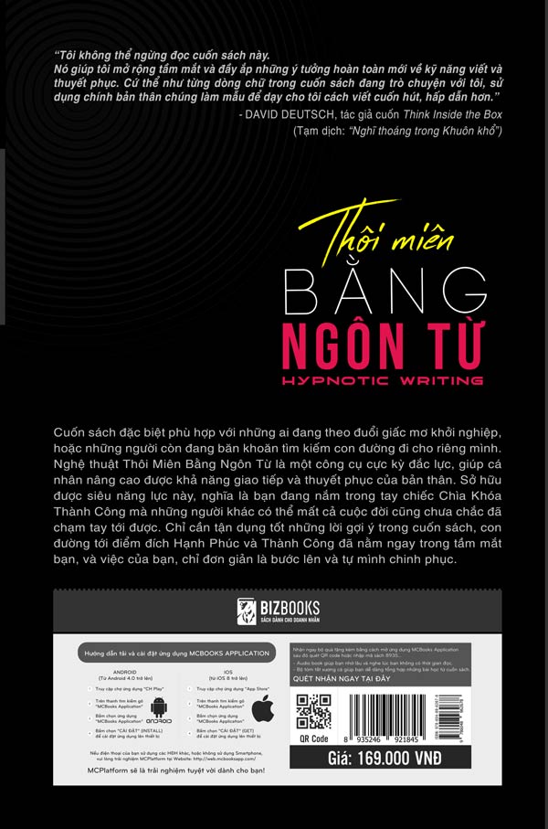 Thôi miên Bằng Ngôn từ không chỉ bàn về kỹ năng viết khiến người đọc bị mê hoặc mà CHÍNH NÓ cũng có thể mê hoặc bất kỳ độc giả nào. Cuốn sách chỉ cho bạn thấy cách trở nên thuần thục trong việc nắm bắt sự chú ý của khách hàng tiềm năng, giữ chân họ, khiến họ phải hành động! Chưa bao giờ có một kho báu quý giá như vậy về kỹ năng xây dựng những bản thảo làm mê đắm lòng người. Những bí quyết trong cuốn sách đều có thể áp dụng ngay lập tức. Đây là công cụ tham khảo toàn năng cho việc soạn thảo văn bản. Đây không phải một cuốn sách mà bạn đọc xong rồi bỏ quên trên giá suốt 20 năm. Nó sẽ nằm ngay trên bàn làm việc để bạn có thể sử dụng hàng ngày.
